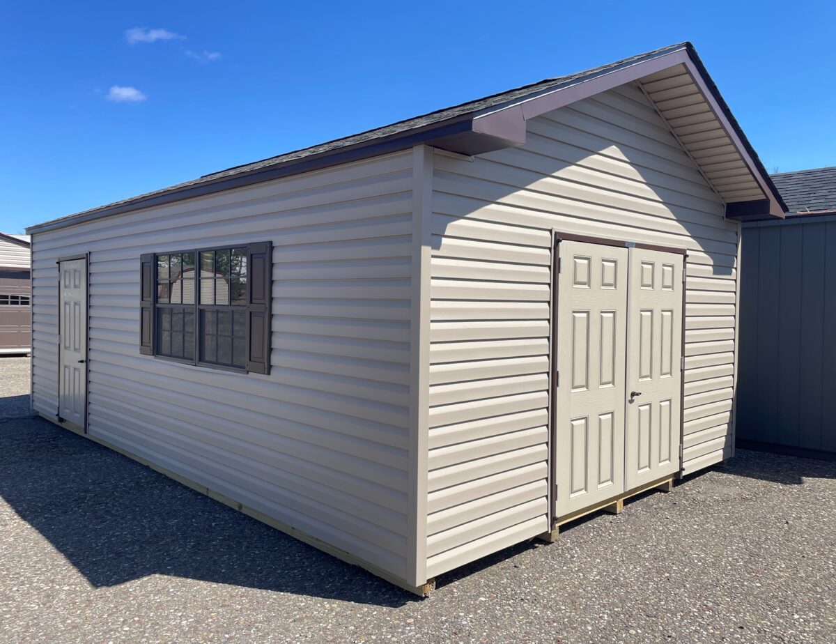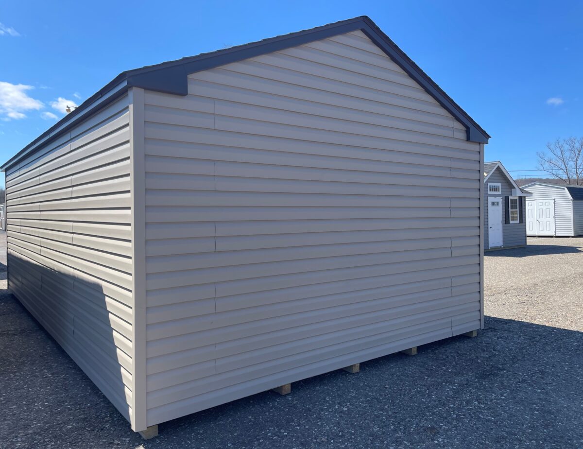 This Amish built maintenance-free vinyl sided 14×24 Peak Front, you can store all your gear with ease in this storage shed! It’s double doors allow easy access for lawn movers, tools, and other large items. It’s superior construction includes 4×4 pressure treated runners, double top wall plates (with interlocking corners), 5/8” engineered Performax floor sheeting, and 2×4 wall and rafter studding on 16″ centers. We don’t settle on lumber quality… we use only top quality lumber on your structure!