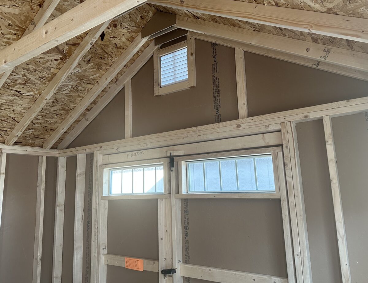 This model features a smart dual-entry layout. The 6×6 double doors on the right gable end provide ample clearance for riding mowers and large equipment, while the 3×6 single entry door on the 14-foot wall—complete with elegant transom windows—allows for quick access to smaller gardening tools and supplies.