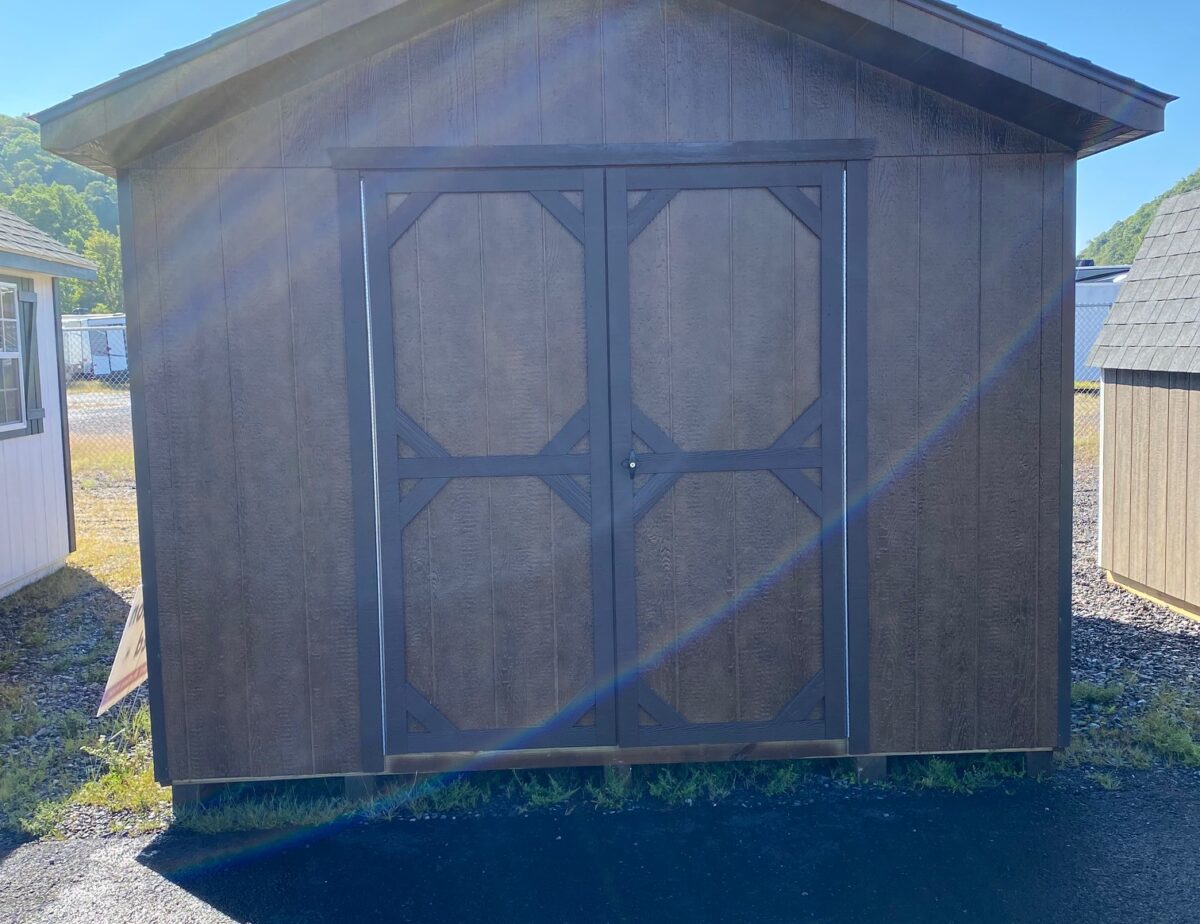 This shed features coffee colored LP siding with dark brown trim and shutters the woodsy look is completed with weather wood asphalt shingles.