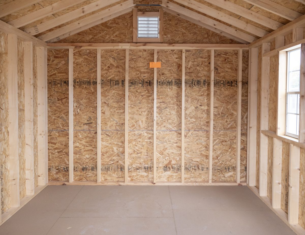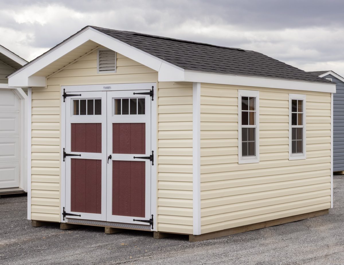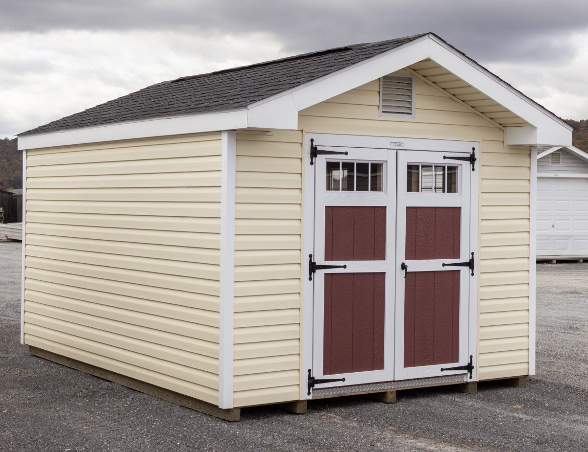 This vinyl sided storage shed is IN STOCK and ready for delivery! It’s superior construction includes 4×4 pressure treated runners, double top wall plates (with interlocking corners), 5/8” engineered LP floor sheeting, and 2×4 wall and rafter studding on 16″ centers. We don’t settle on lumber quality… we use only top quality lumber on your structure. It even comes with a 6-Year Top-To-Bottom Warranty!