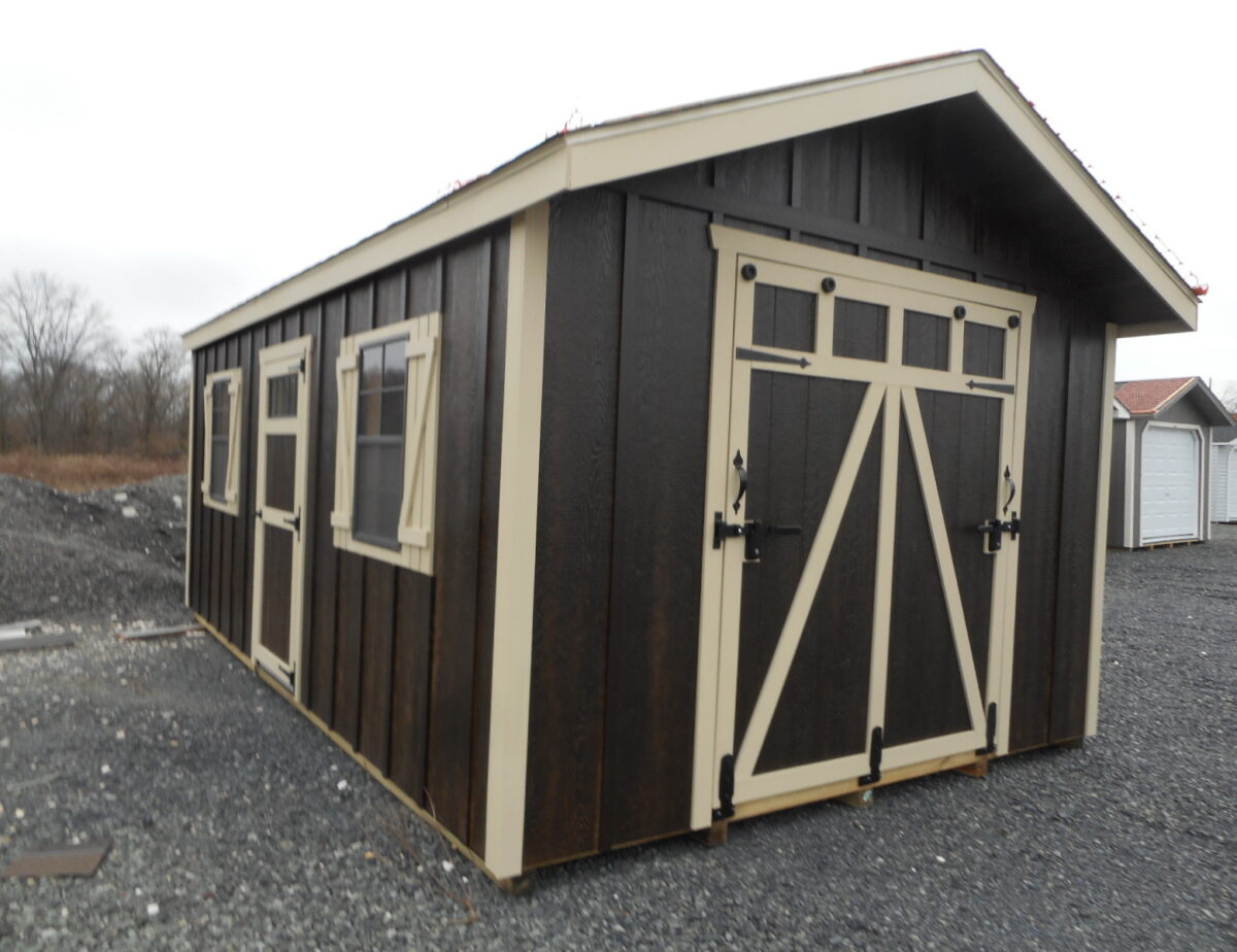 Our beautiful peak style sheds are a great option if you’re looking for a shed that matches the style of your home. They compliment almost any home. It’s Rampage door folds down and allow easy access for lawn mowers, tools, and other large items. There’s (15′) Single-over Ridgevent installed to help the hot air inside your building escape, especially in those warm summer months. We’ll deliver it as you see it, fully assembled and ready to use!