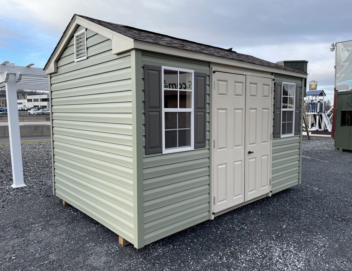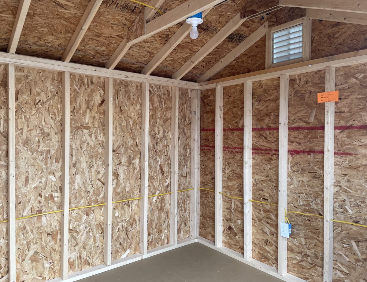 Our Side Entry Peak sheds come standard with 2″x4″ construction 16″ OC, a 5/8″ coated engineered floor, a double door, two windows with shutters and a shingled roof. All 6′ wide buildings include one 36″ door, one window with shutters and a shingled roof.