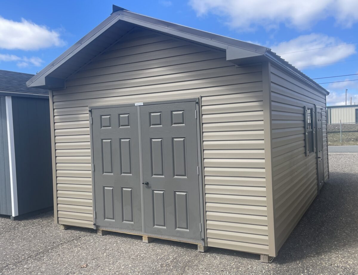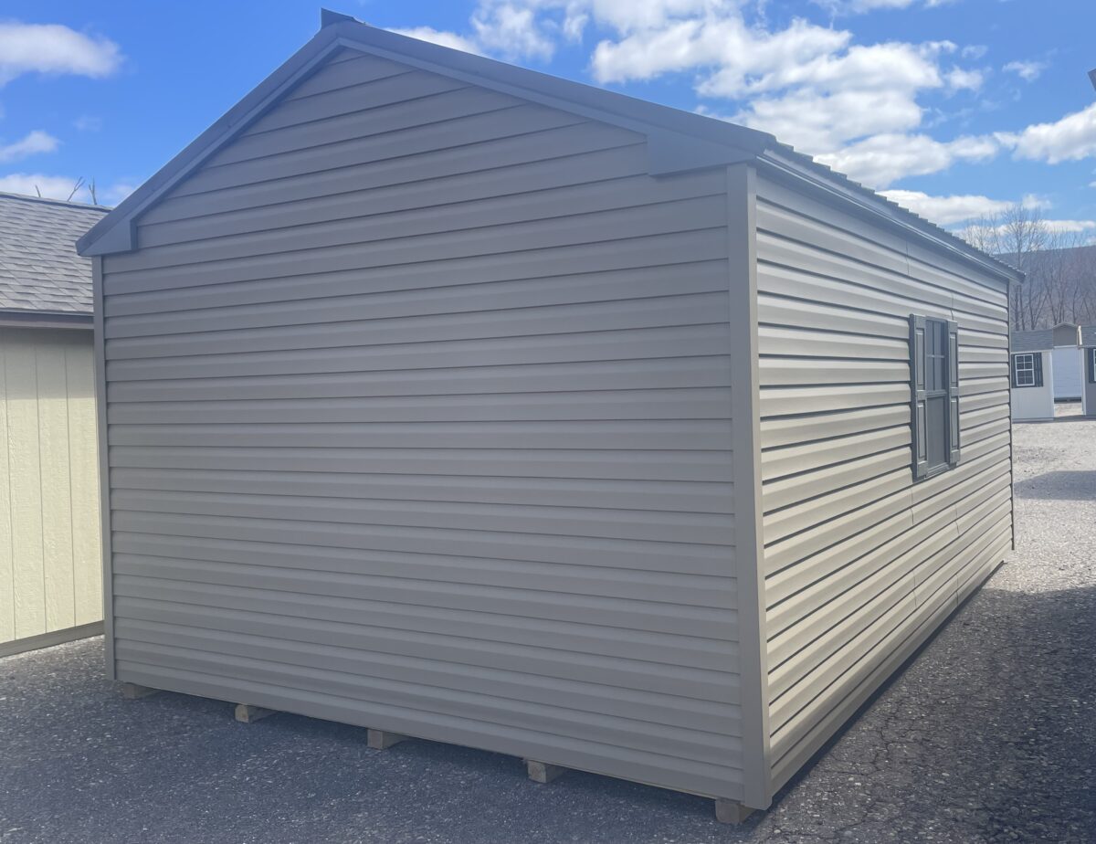 This Amish built maintenance-free vinyl sided 12×20 Peak Front, you can store all your gear with ease in this storage shed! It’s double doors allow easy access for lawn movers, tools, and other large items. It’s superior construction includes 4×4 pressure treated runners, double top wall plates (with interlocking corners), 5/8” engineered Performax floor sheeting, and 2×4 wall and rafter studding on 16″ centers. We don’t settle on lumber quality… we use only top quality lumber on your structure!