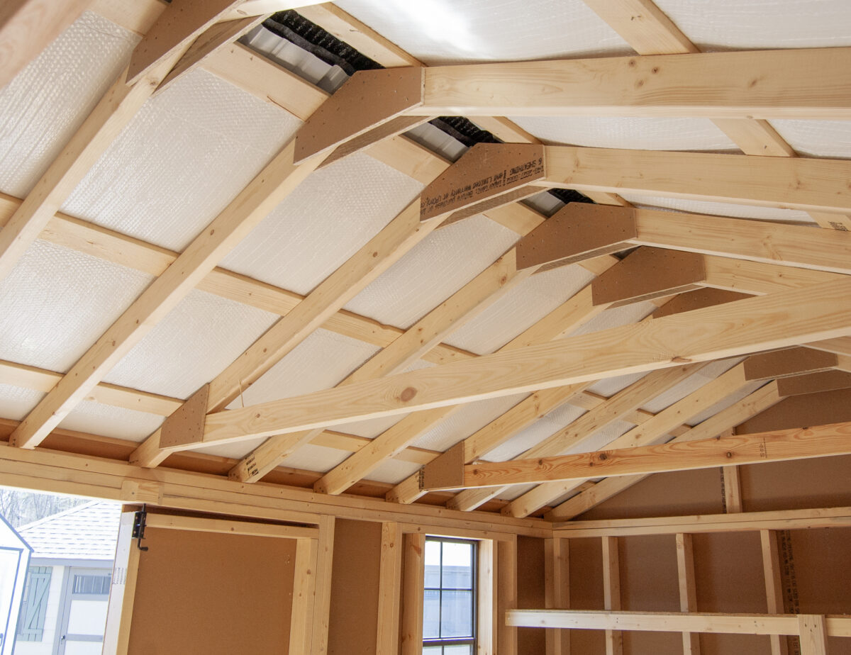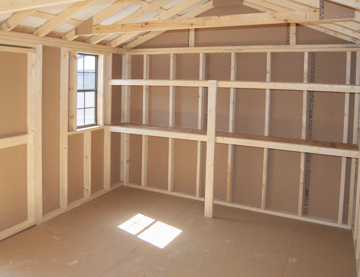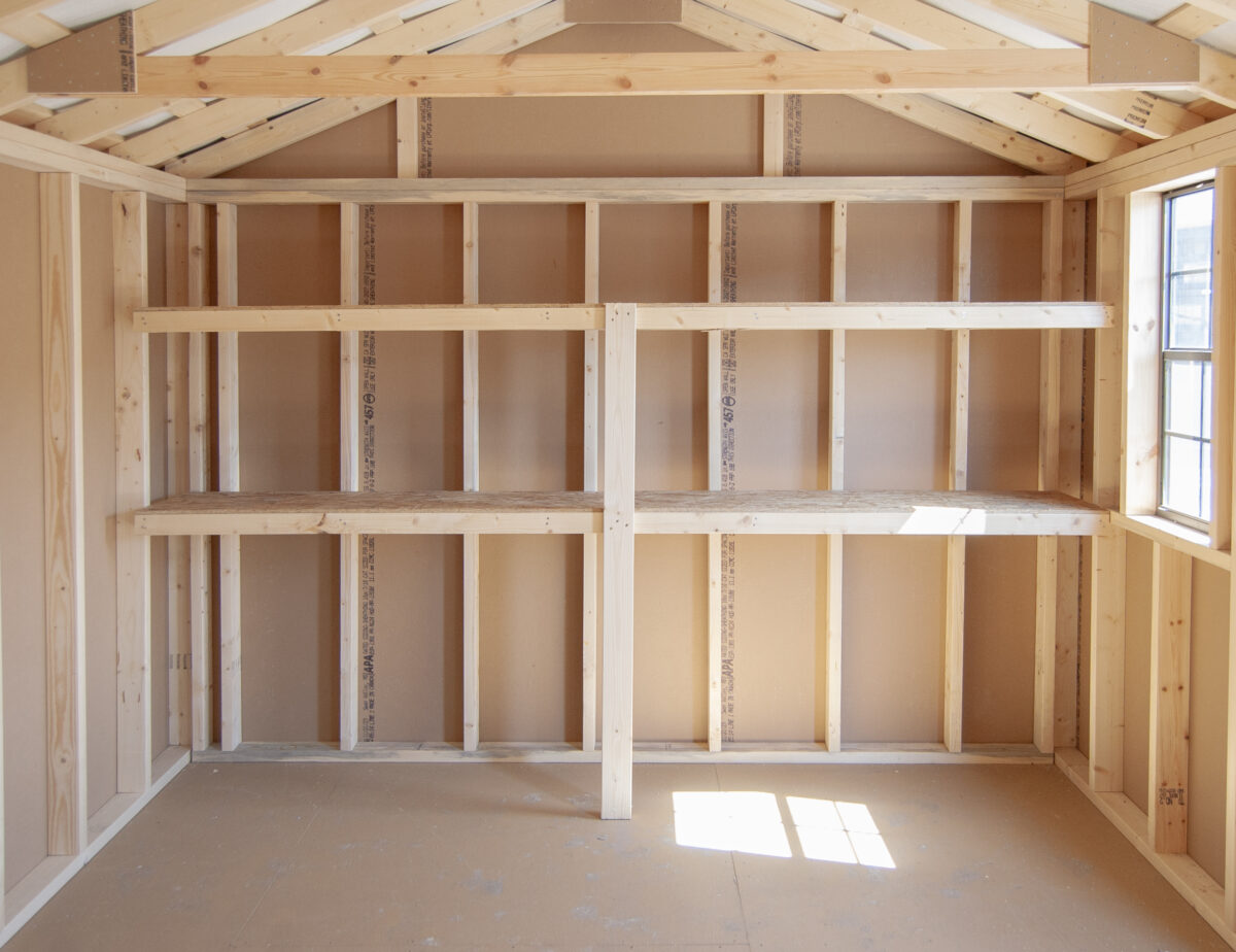 We build sheds better with 4×4 pressure treated runners, double top wall plates (with interlocking corners), 5/8” engineered floor sheeting, and 2×4 wall and rafter studding on 16″ centers. Our Amish craftsmen also installed tons of shelving inside to organize all your boxes, totes, and small items. They also added a diamond tread plate at the doorway for extra protection and durability in this high traffic area.