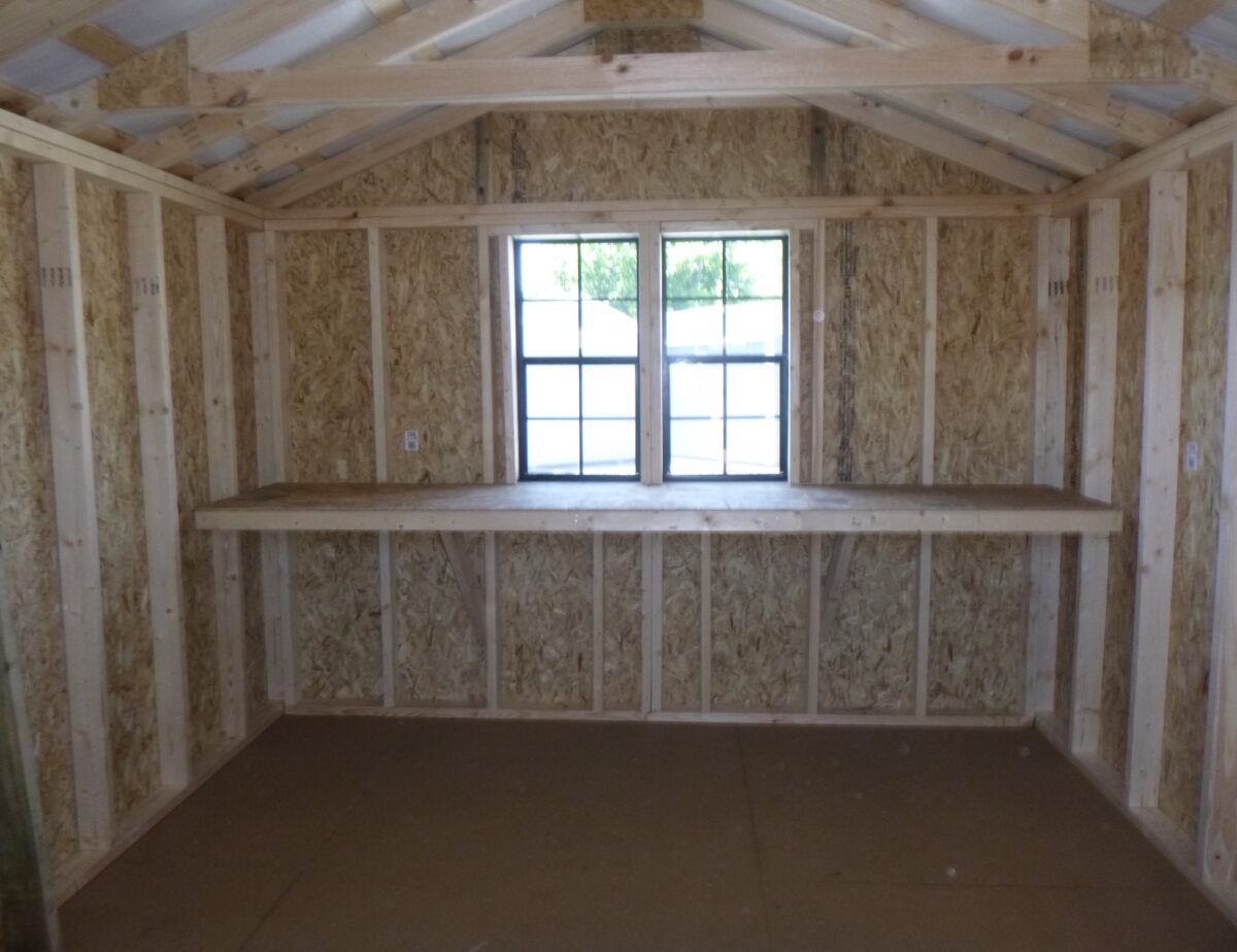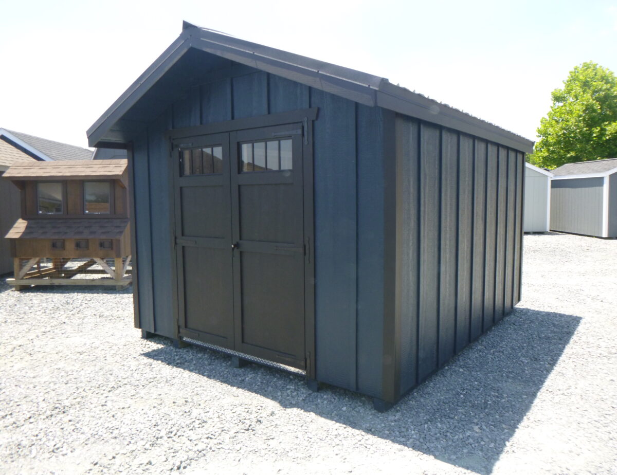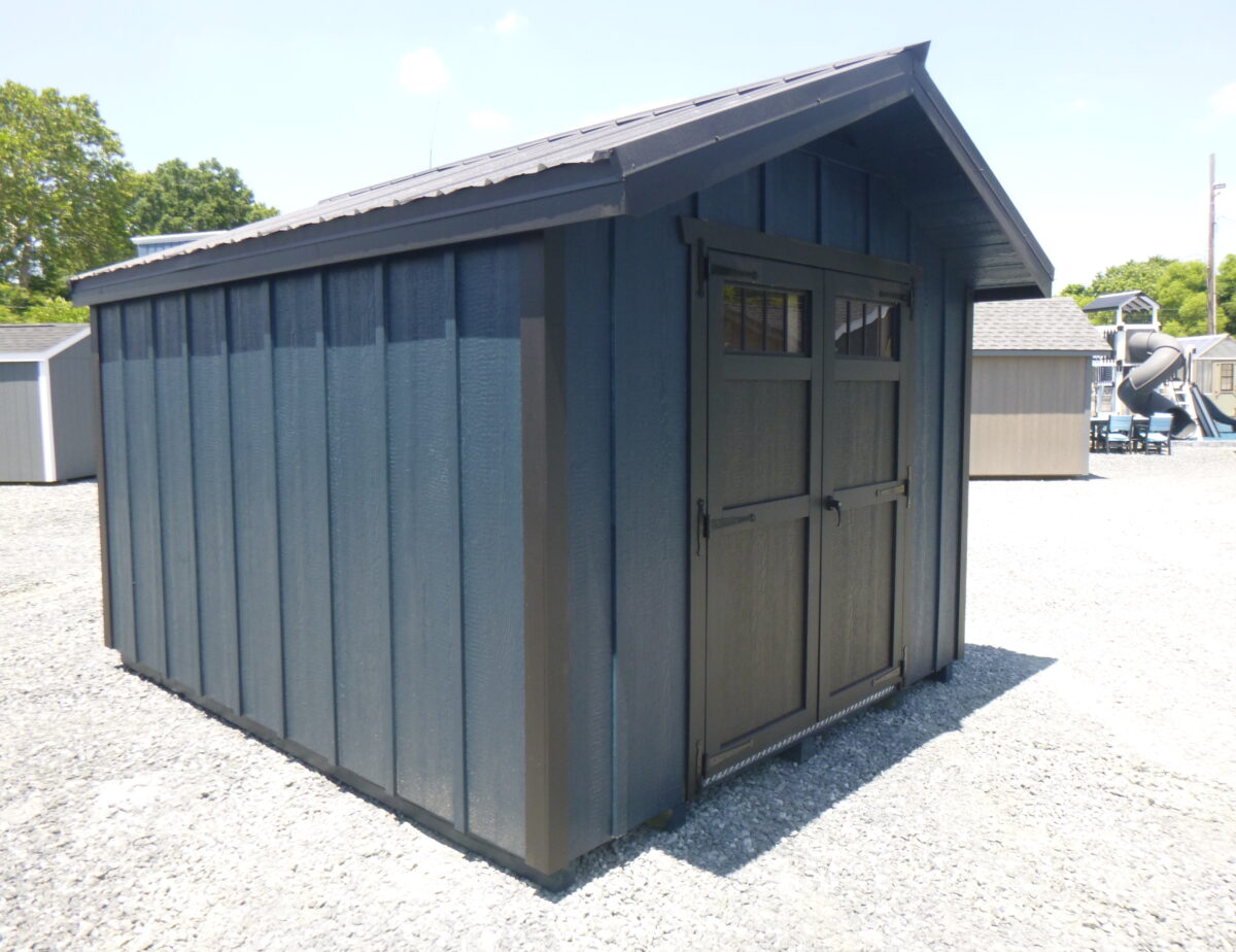 10 x 12 Peak front shed features; 5/8″ PerformMax 500 w/Ovation Overlay sheeting, pressure treated 4×4 runners and 2×4 floor joists, 2×4 wall and rafter construction (16″ on center), 16″ roof overhang with aluminum drop edge and aluminum corner trim, aluminum hinges, double top wall plates and studded corners, LP B&B Smart Side with coated finish on the inside. Upgraded Black Textured Metal Roof. All materials designed and engineered specifically for use in your shed so they will hold up over a lifetime of use and still maintain their integrity.
