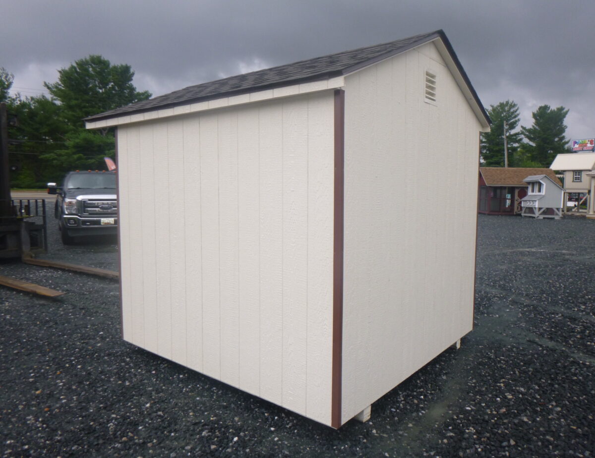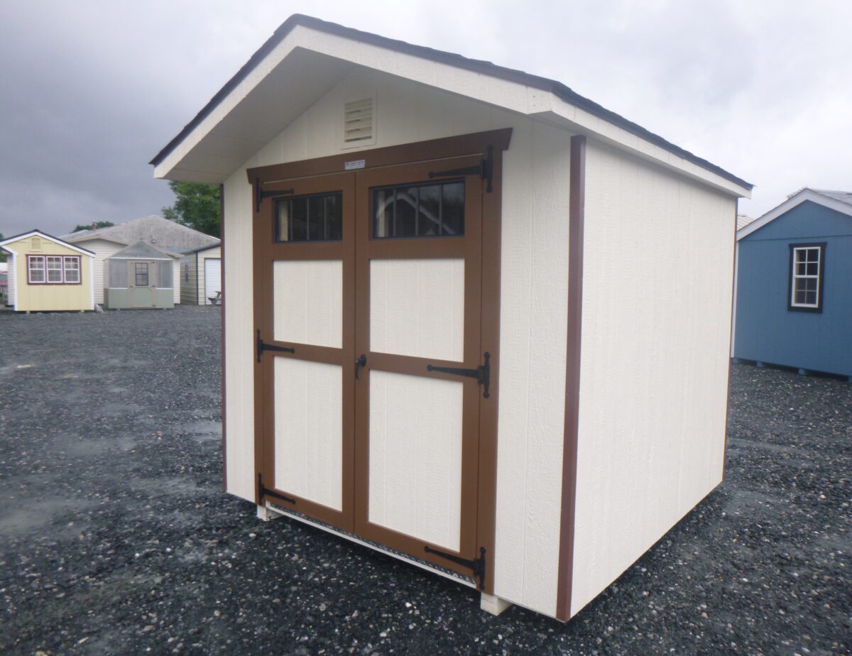 8×8 Peak front shed features; 5/8″ PerformMax 500 w/Ovation Overlay sheeting, pressure treated 4×4 runners and 2×4 floor joists, 2×4 wall and rafter construction (16″ on center), 16″ roof overhang with aluminum drop edge and aluminum corner trim, aluminum hinges, double top wall plates and studded corners, LP Smart Side with coated finish on the inside. All materials designed and engineered specifically for use in your shed so they will hold up over a lifetime of use and still maintain their integrity.