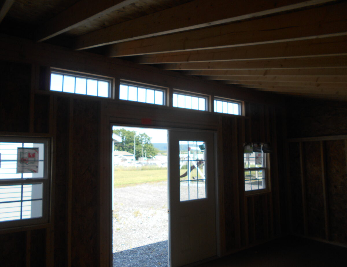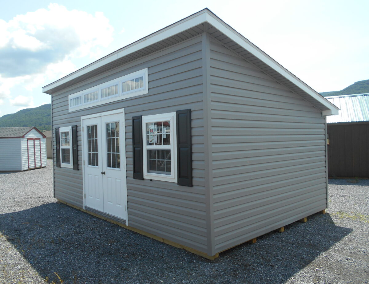 Check out this stunning studio vinyl sided peak perfect for storage or even if you would like to use it as a little store front this building features two double doors with a window on each side also has some transom windows above doors for extra lighting this building is sure to catch the eyes of people passing by. Features graphite grey vinyl siding and white trim also comes with pewter shingles 6 ft double house door, 30×36 insulated windows, 2×6 rafters and 4 3 foot transom windows. Transom windows are insulated as well !