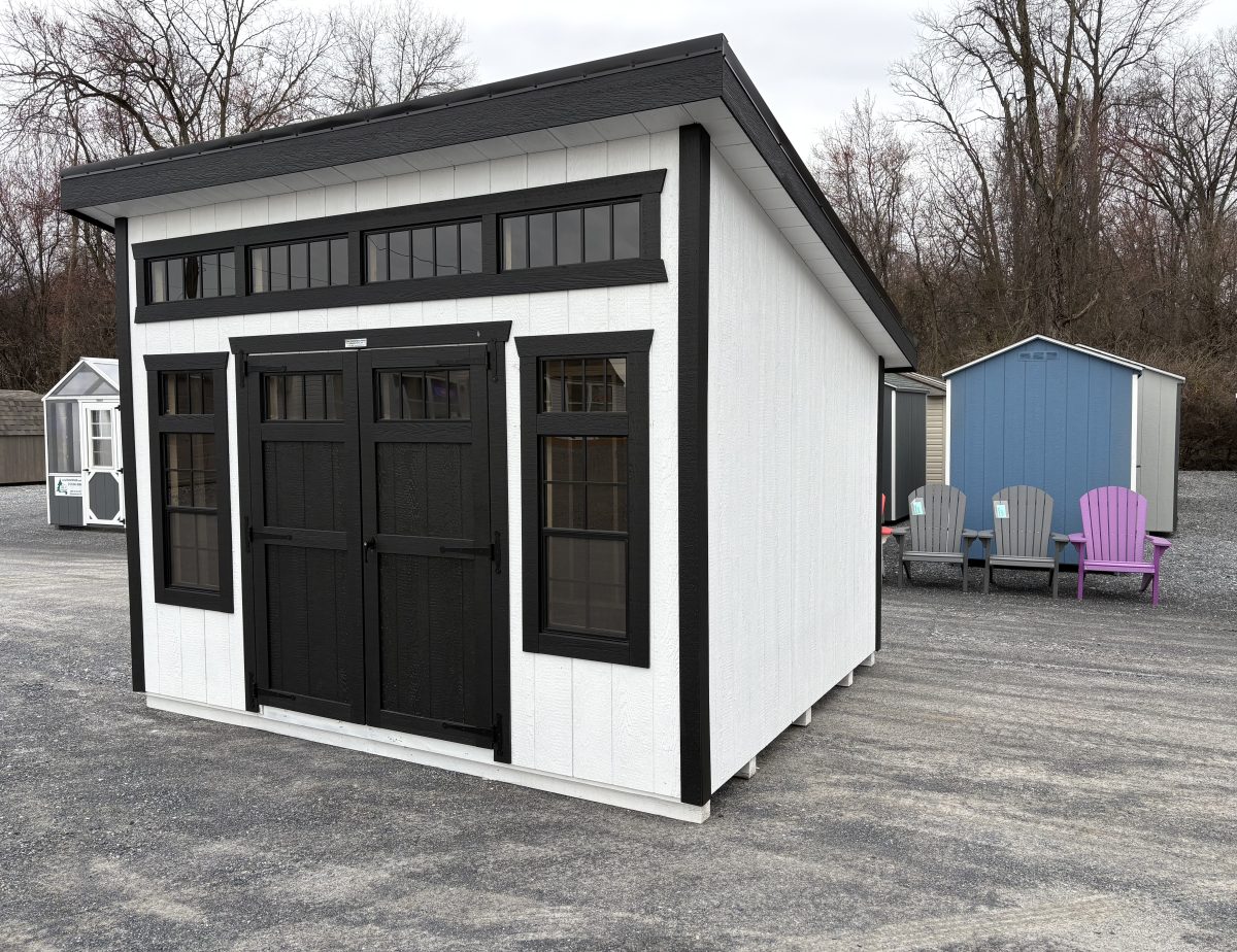 This 10×12 studio will give a modern look in your back yard. comes with transom windows and insulated metal roof.