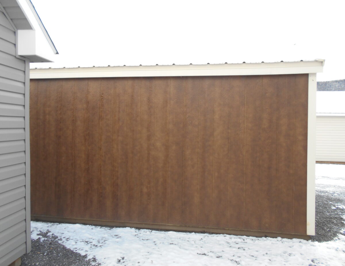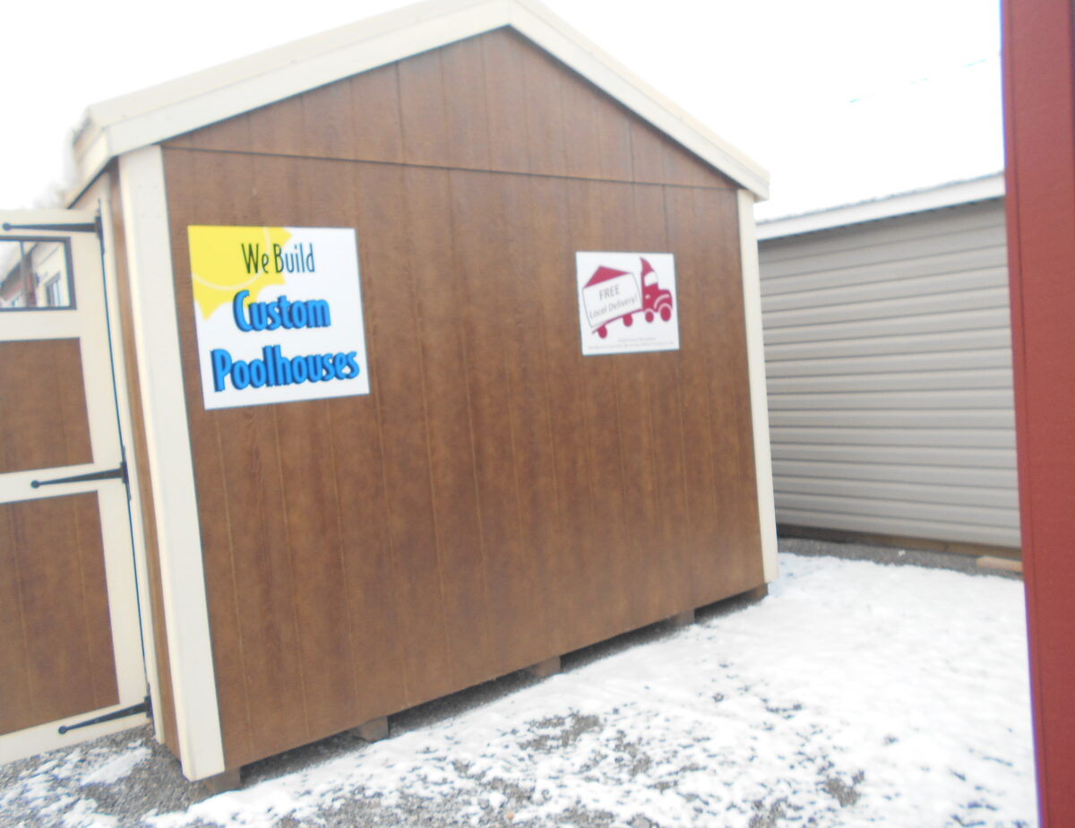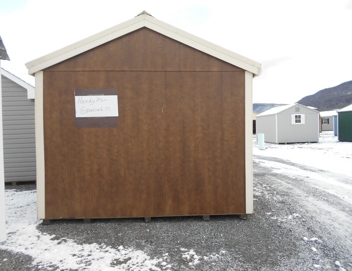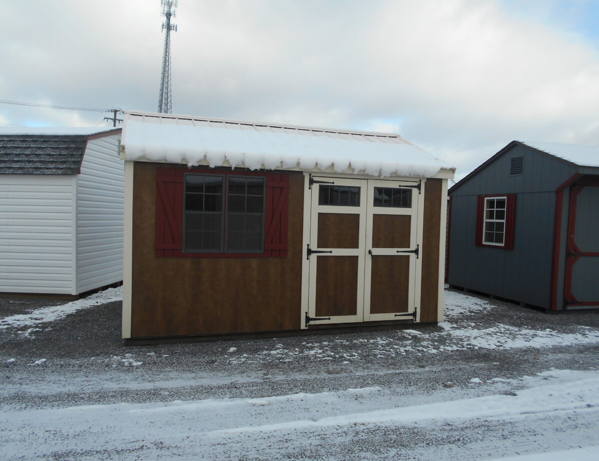 10 x 14 Side peak features Coffee colored siding and Navajo white trim also comes with red shutters and a cobble stone metal roof. This building is perfect for a workshop as it already has the hole in the gable for a wood burner in the side and also has linoleum down on the floor. Comes with one 5′ door and two windows, Also comes with our new England style package and double bubble wrap under the roof.