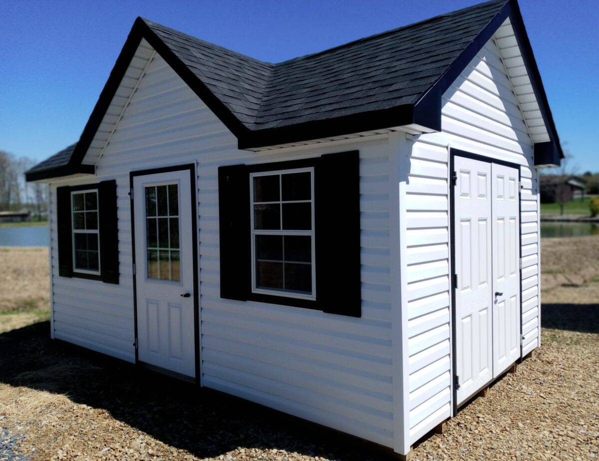 Deluxe Victorians have 8” roof overhangs on all sides that are enclosed with soffit. Deluxe Victorians include a double door, a single entry door, and two windows. Deluxe Victorian sheds with vinyl siding include raised panel shutters, deluxe aluminum trim about windows, and one of three window design choices for single door.