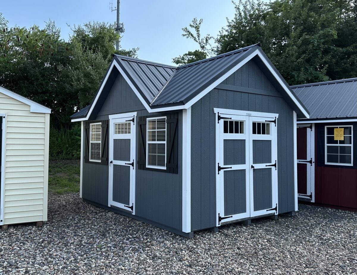 This 10×14 Victorian Deluxe is located at our Berlin CT location. The Victorian comes standard with a single door, double door, and 2 24×36 single hung windows as well as a 8/12 roof pitch. We placed transom windows in all of the doors of the building to bring in even more natural light. Completed with a ramp system, a 4×10 loft which gives you additional storage room for seasonal items, a 10’ ridge vent, and a diamond kickplate under the single entry door to protect the flooring. With 50 year LP Smart siding, lifetime Timberline shingles, and a 25 year PerformMax floor, this structure is Amish built to last.