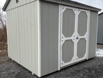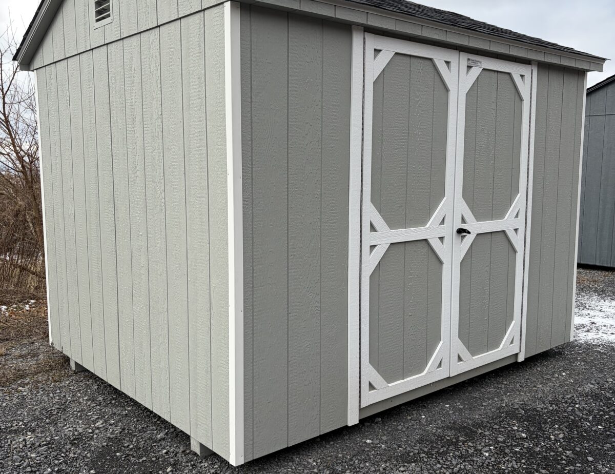 8×10 Madison Peak in Light Grey Lp smart sidings and White trim with a Black Shingled roof also comes with One Double Style door and 5/8 Coated Floor with 16″ on center floor joist and two 4×16 End vents perfect basic storage shed.