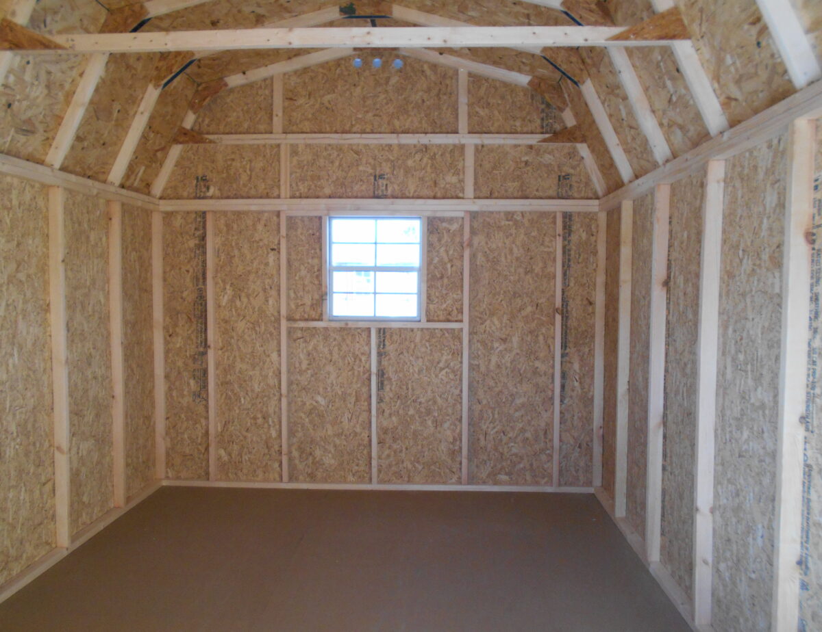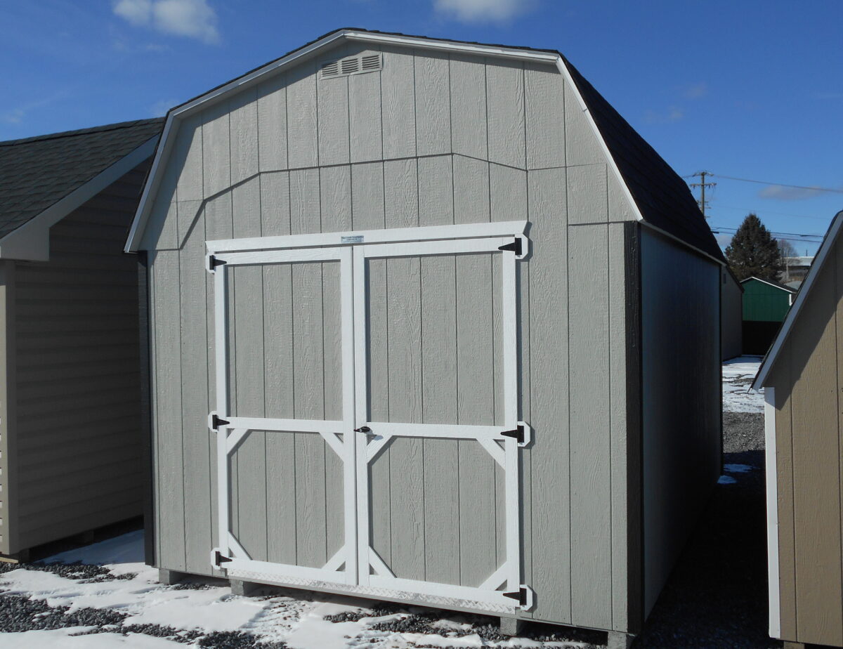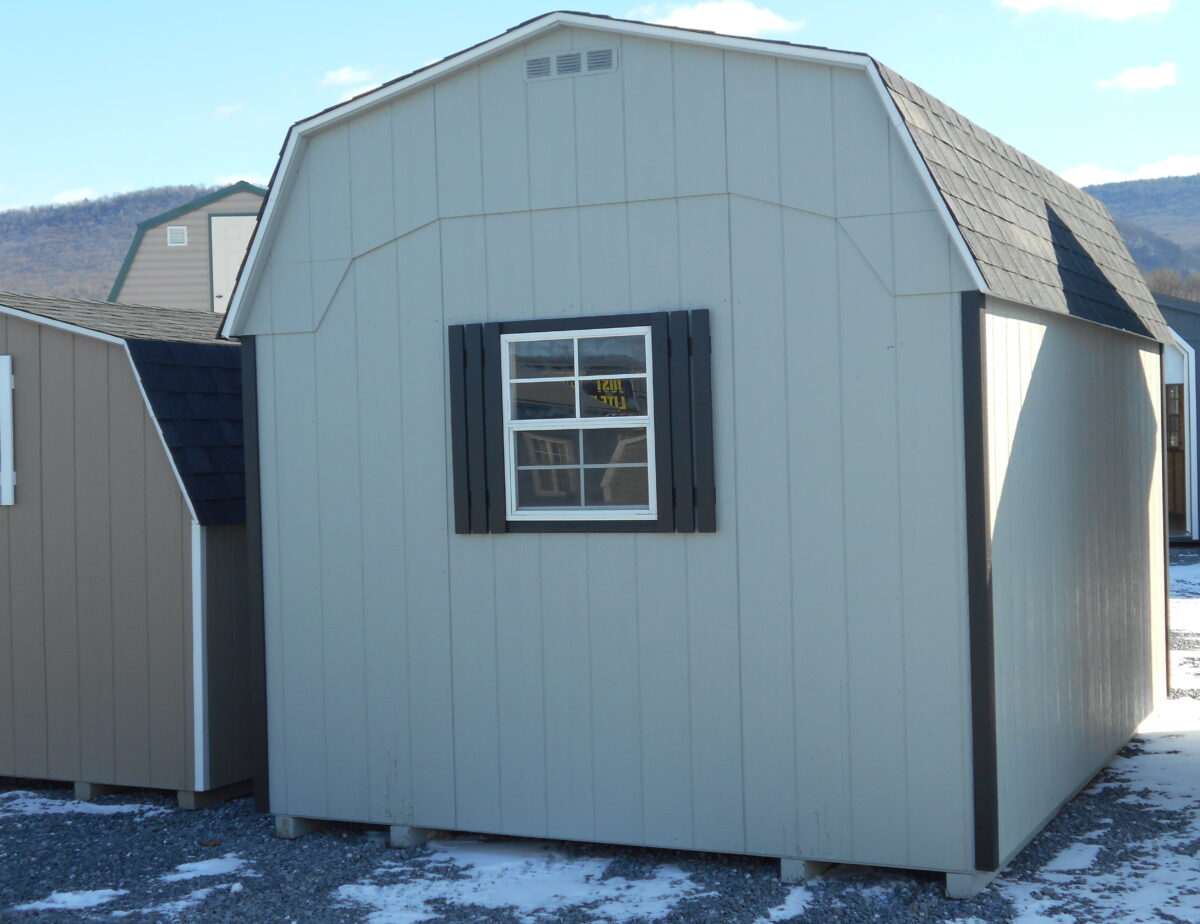10×14 Madison Dutch features Light Gray Lp smart siding and white trim with black shutters also comes with a Rustic black shingled roof, One 6′ Double doors, One 24×27 Slider Windows a coated floor, and 3″ Corners in black also comes with 5″ Diamond tread plate And two end vents.