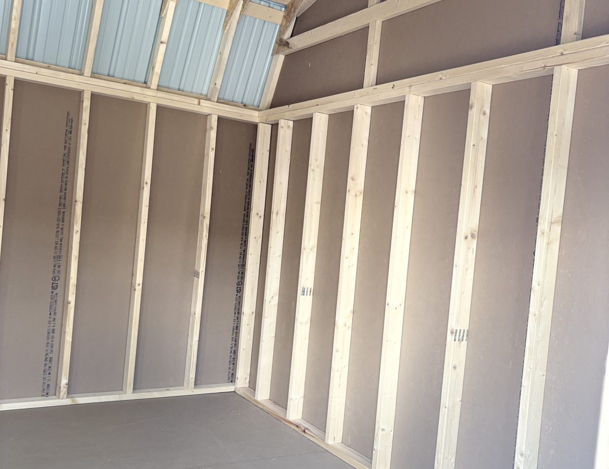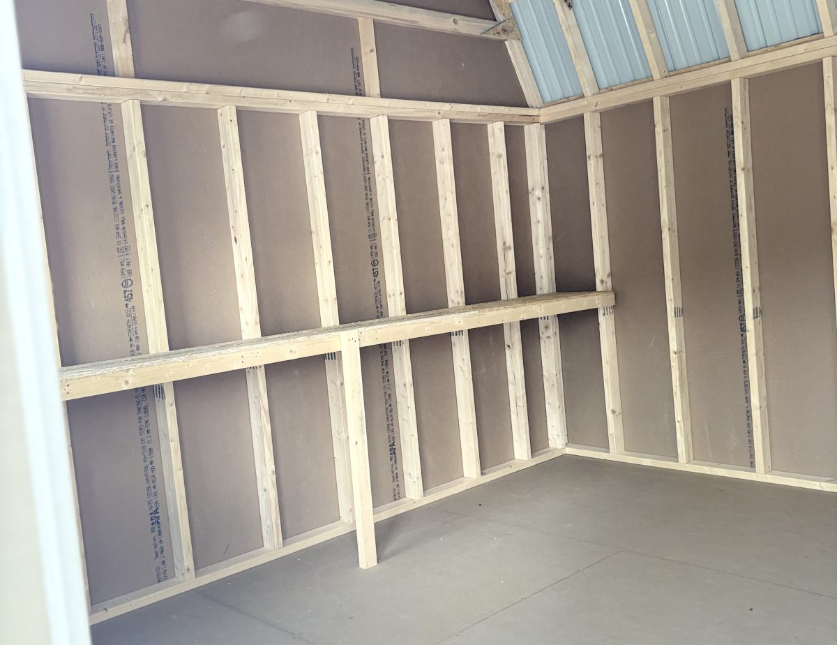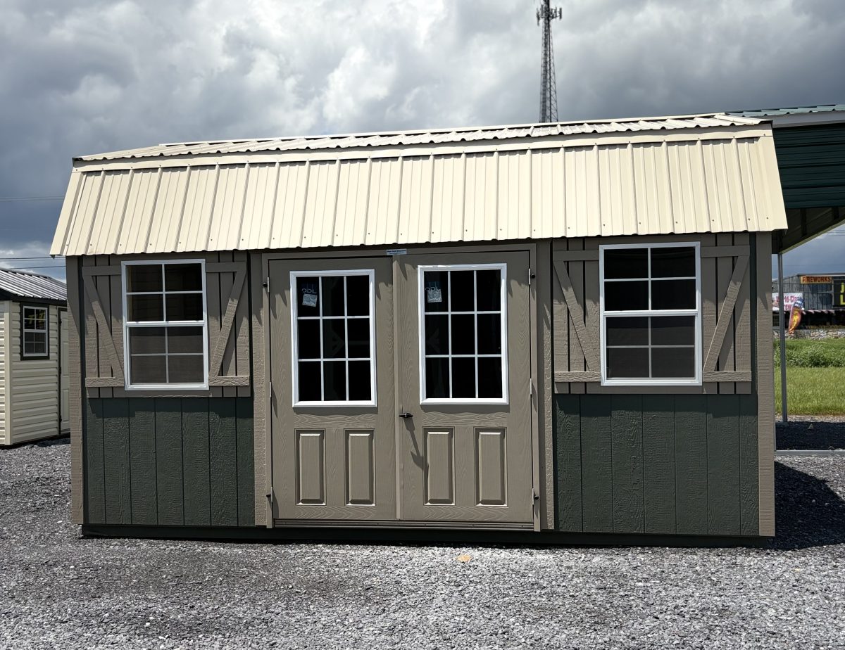 12 x 16 LP smart sided in avocado with PC clay trim and PC clay colored shutters also has a upgraded beige metal roof and also is upgraded with one 6 x 6 artesian colored slab nine light door, a New England package, a double nine light slab door two 12 x 12 vents and one 6’ ramp also has a 16 x 12 shelf already built inside for any of your needs.