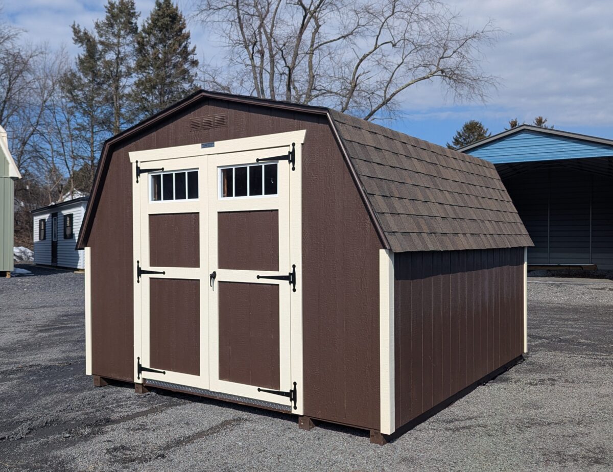 This 10×12 Madison Mini Barn arrives in a classic, attractive color scheme. The Dark Brown LP SmartSide siding pairs with Navajo White trim to create a balanced look that fits a variety of outdoor spaces. In addition, you can add optional windows, shelving, loft space, or ramps if you want more organization.