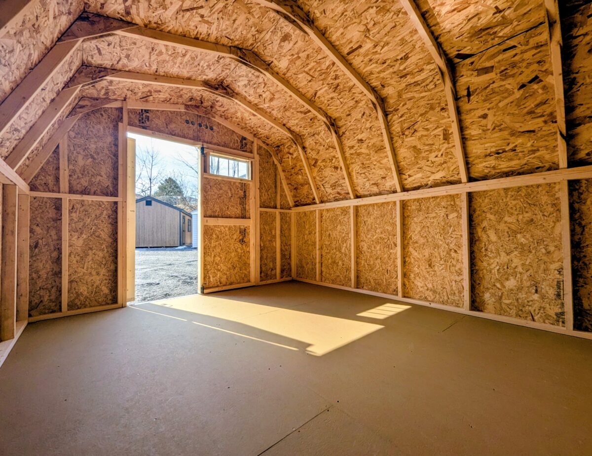 The 10×12 Madison Mini Barn is designed for changing conditions throughout the Wyoming Valley and broader NEPA area. A Heavy-Duty Coated Floor upgrade adds protection against moisture and daily wear. Therefore, it becomes a reliable choice for heavier equipment. The structure also includes 1×3 wood corner trim, roof overhangs, and gable vents. These features encourage airflow and help reduce heat buildup inside the building.
