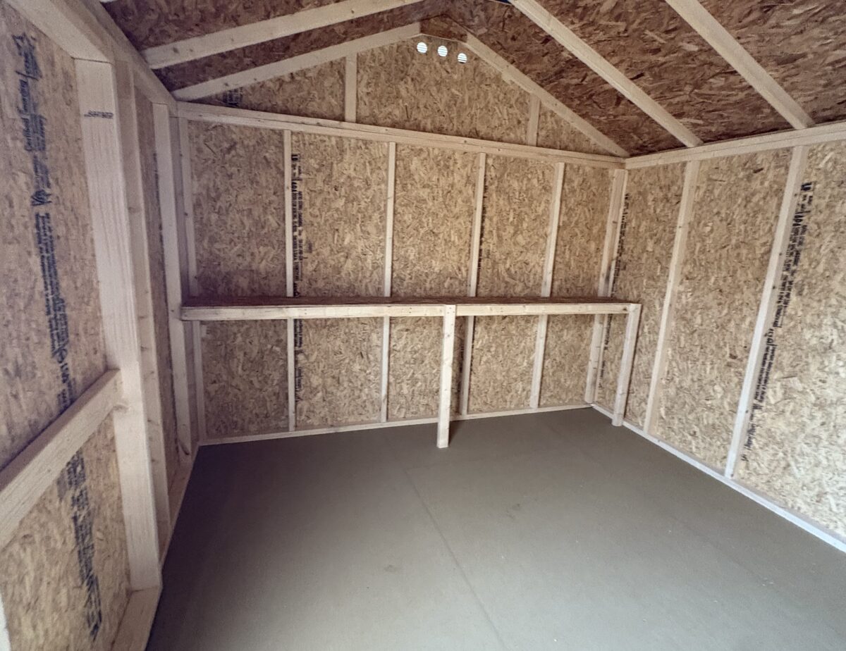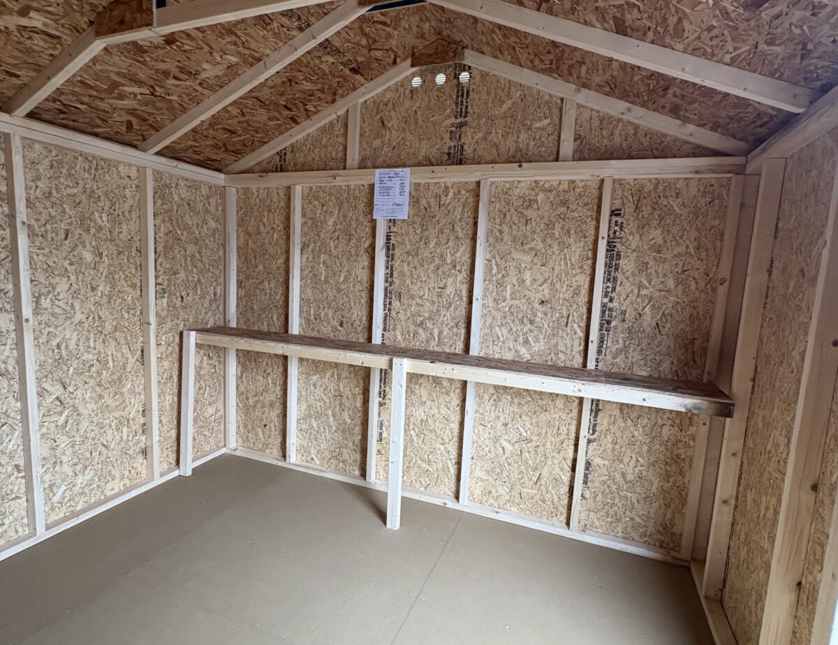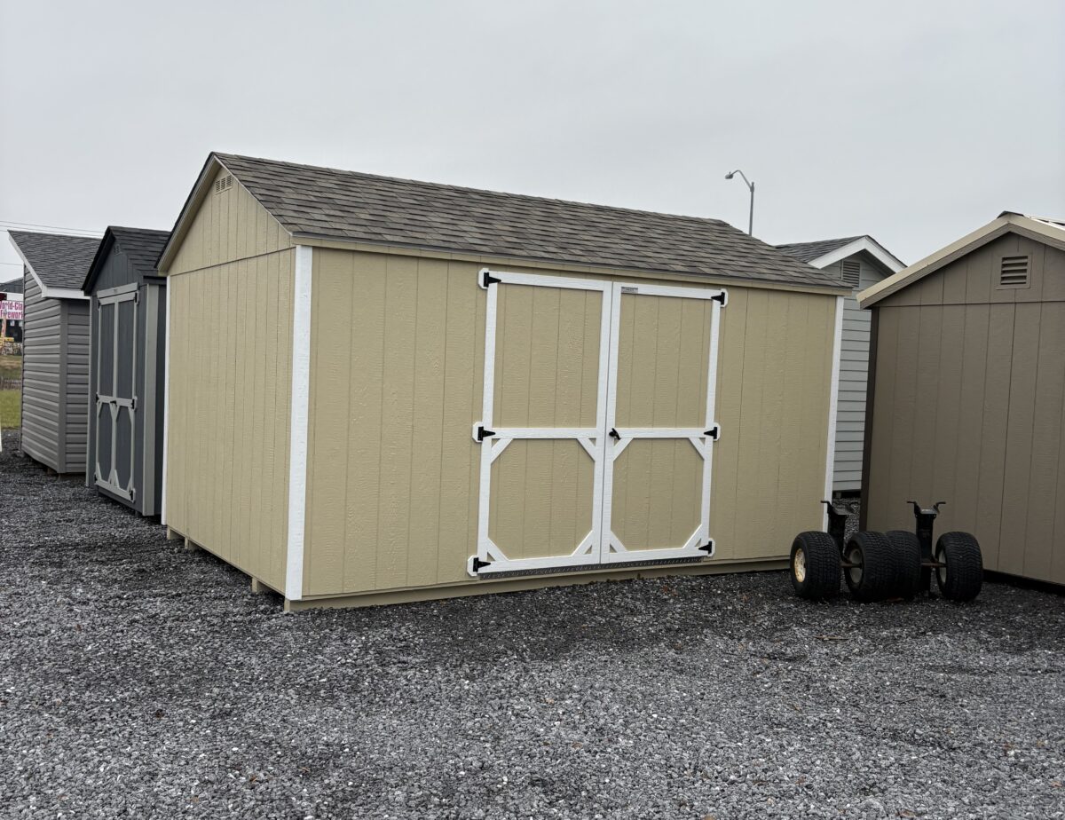 10×14 Madison Side Peak Comes with Lp Beige siding and White Trim with a natural timber shingled roof One 6′ Double door 3″ Corners, 1 Shelves 12” and a coated floor also comes with a 6′ Diamond plate.
