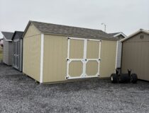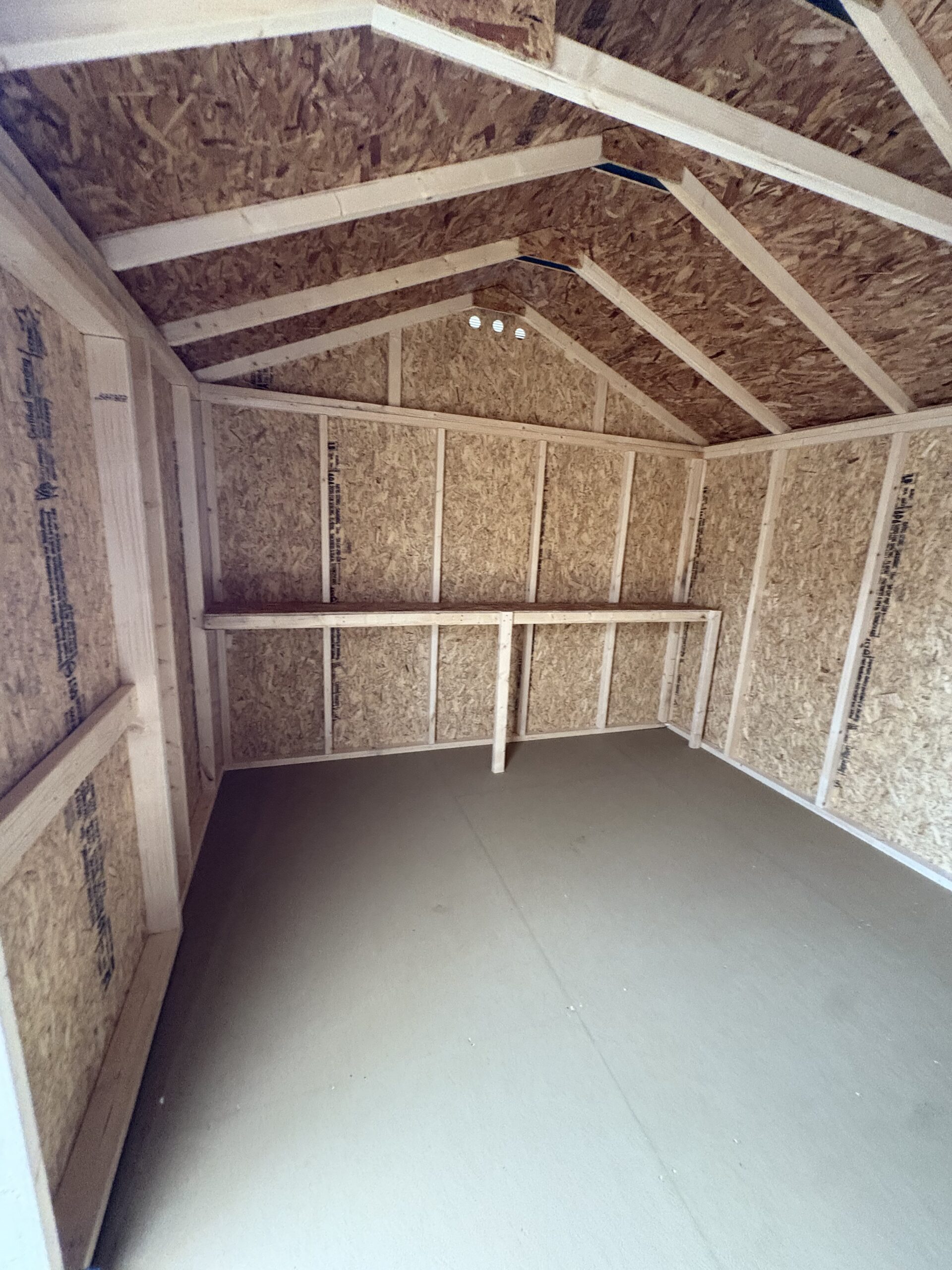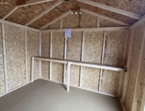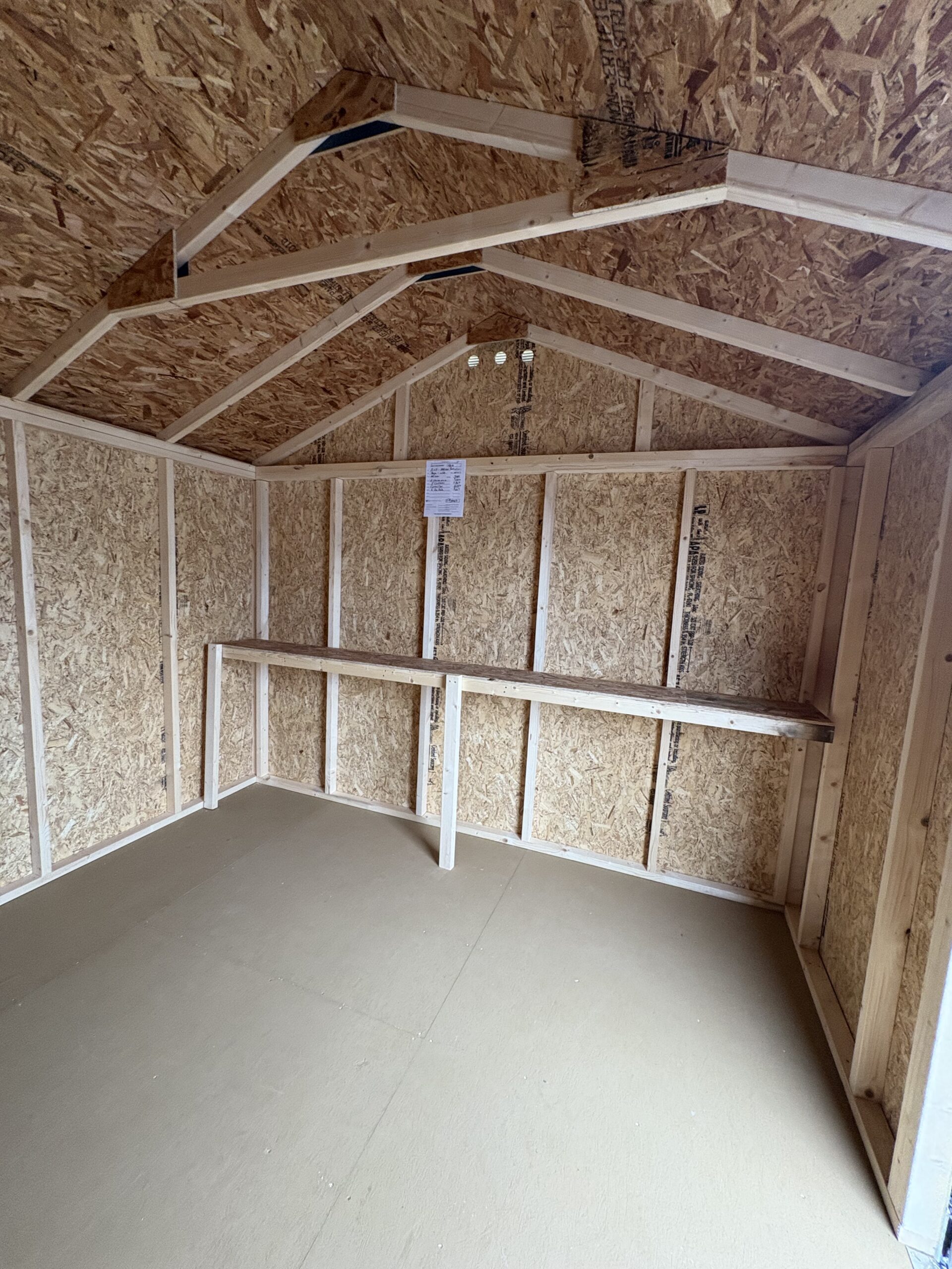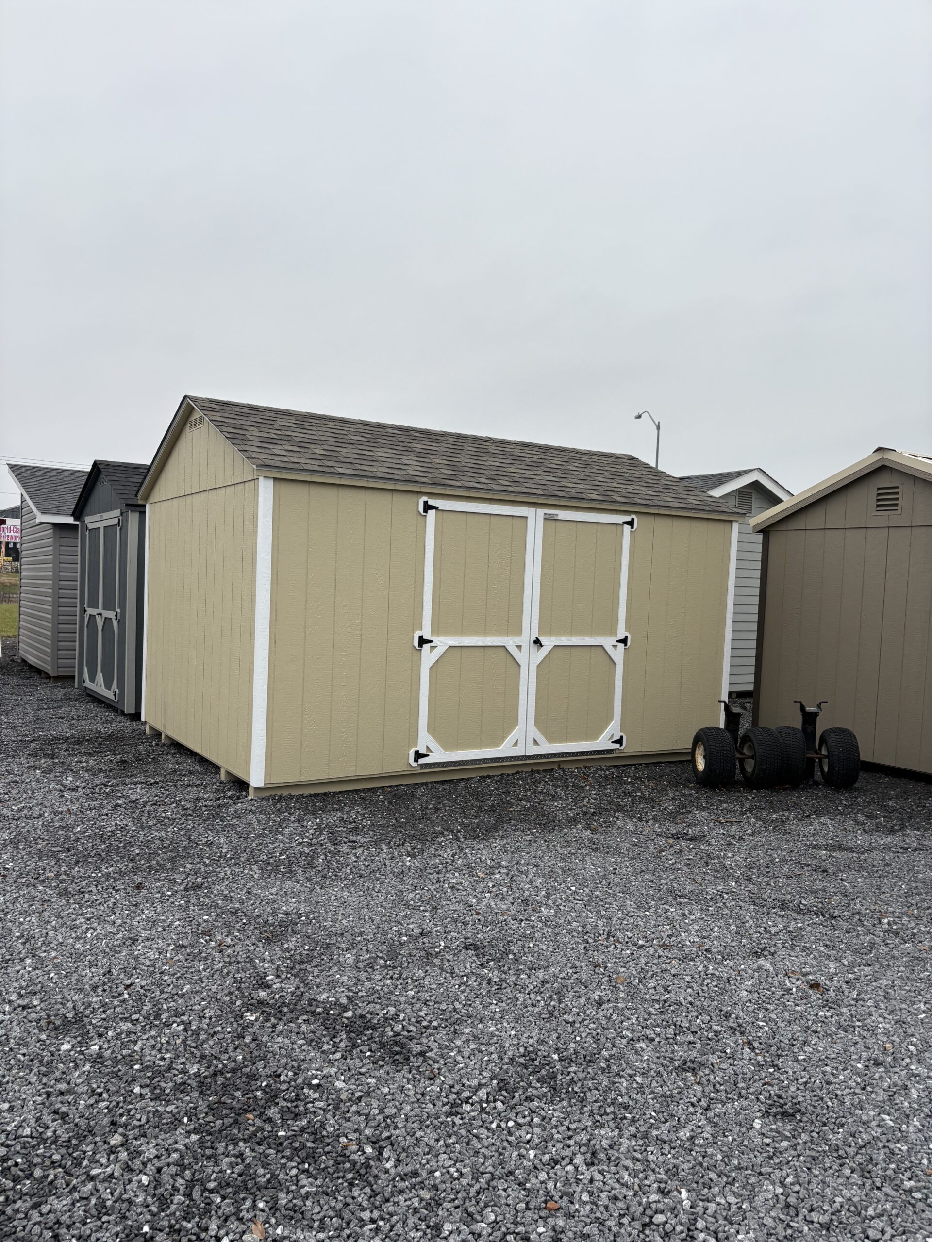 10×14 Madison Side Peak Comes with Lp Beige siding and White Trim with a natural timber shingled roof One 6′ Double door 3″ Corners, 2 Shelves 12” and a coated floor also comes with a 6′ Diamond plate.