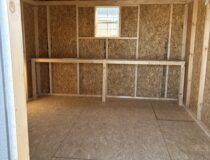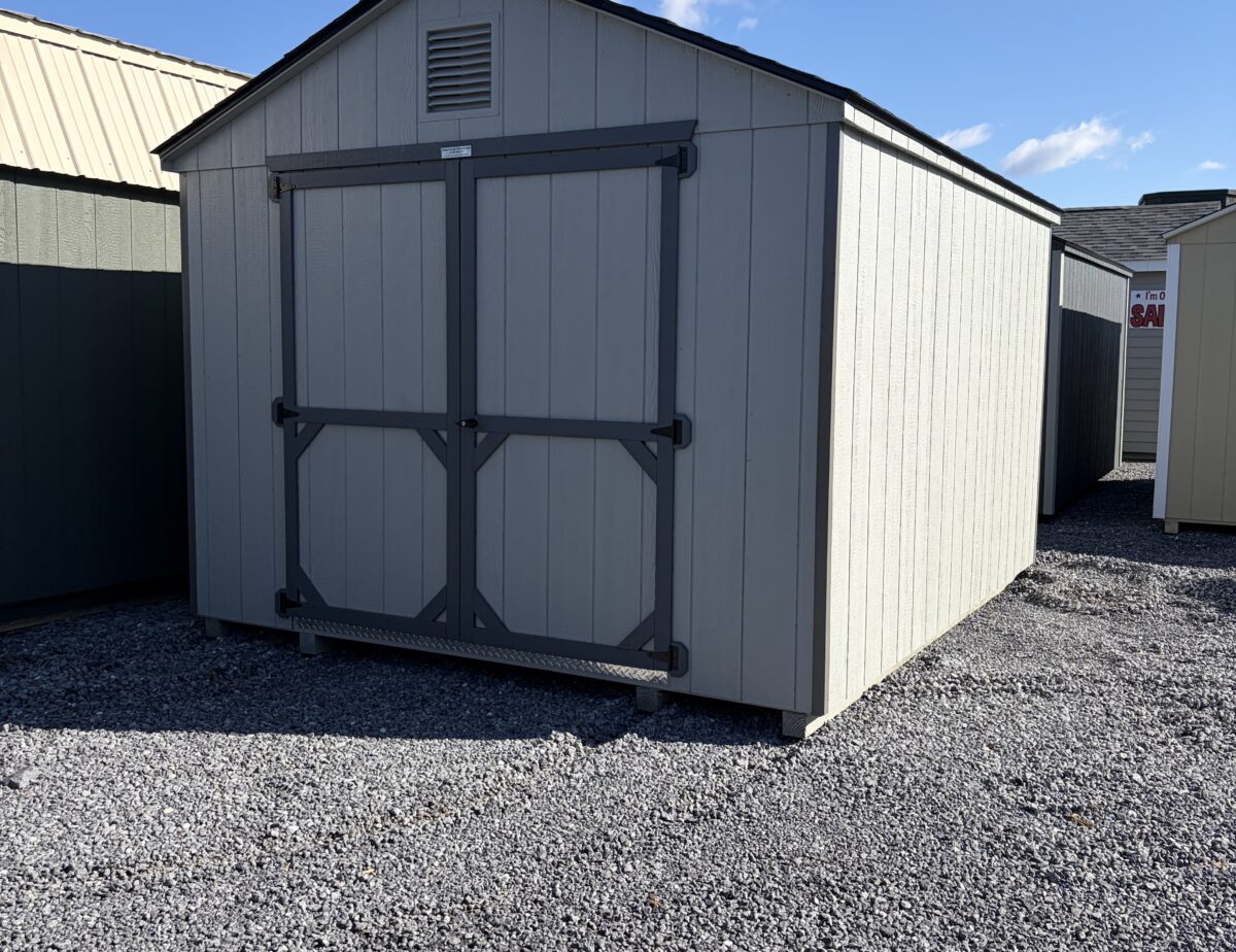 10×12 Lp smart sided Madison peak has light grey siding with dark grey trim and dark grey shutters also has a black shingled roof very simple yet modern style building.