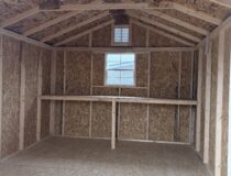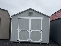 10 x 14 Madison peak light grey lp smart siding with white trim also comes with black shingled shutters this building is perfect for any of your outdoor storage needs.