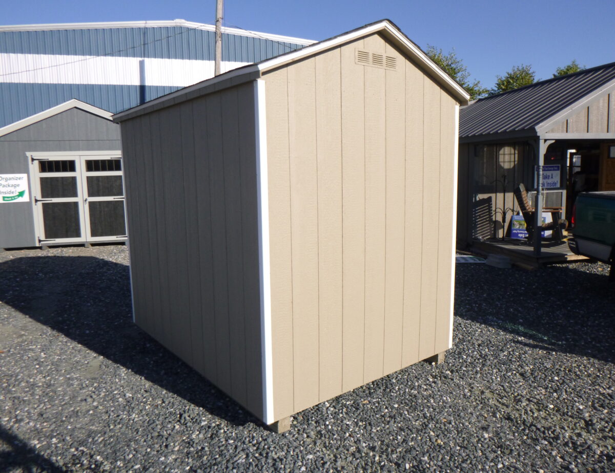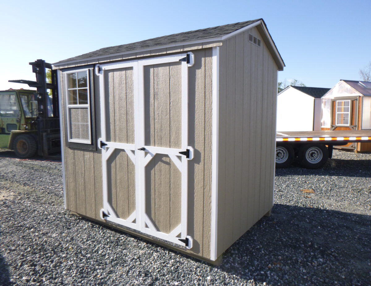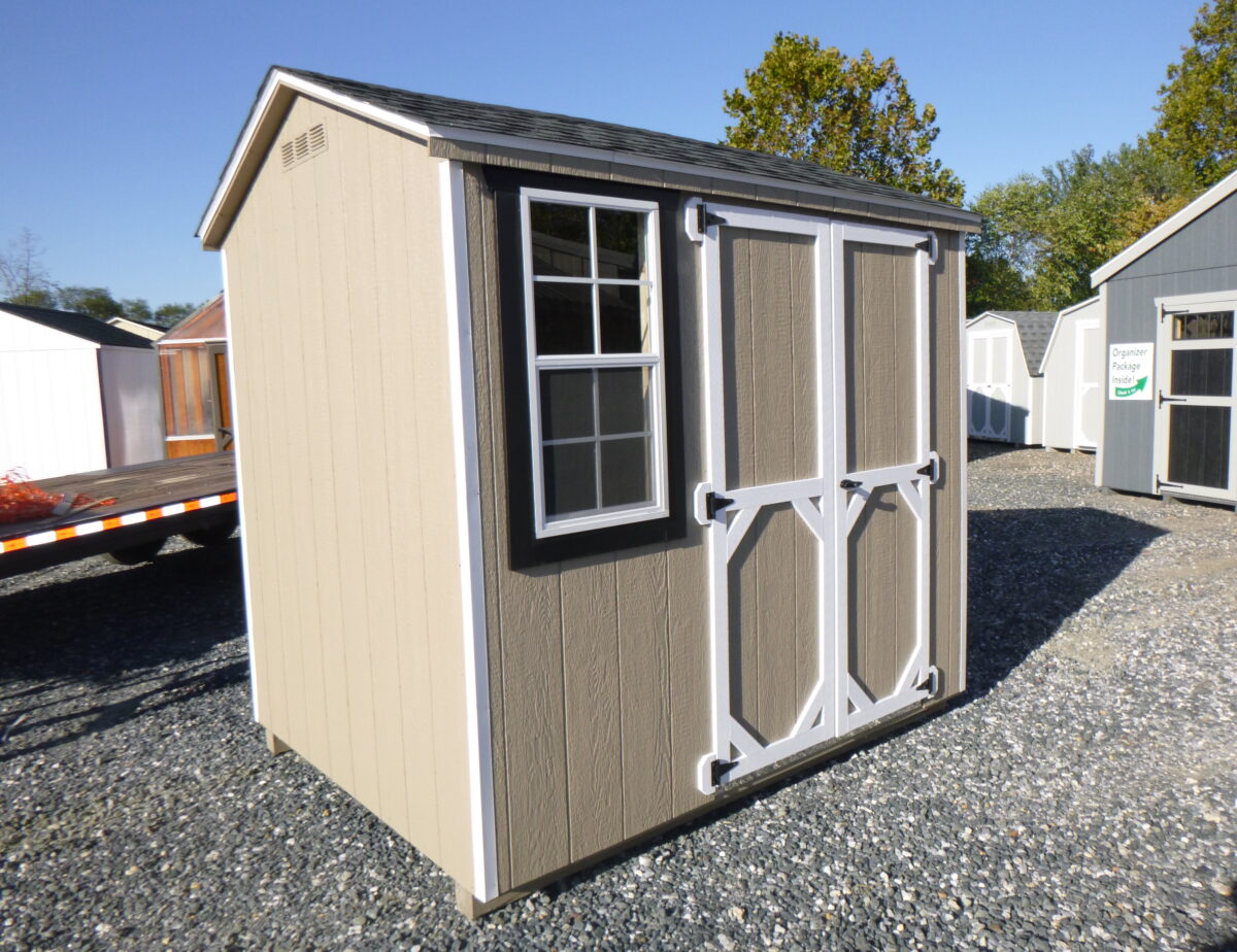 Our Madison Series storage sheds are the economical choice, designed with a lighter build to be budget friendly. The Madison Series includes lifetime shingles, 3” overhang with aluminum drip edge, aluminum corner trim, two end vents, and a keyed door handle. It’s built with 2×4 floor joists (spaced 16” on center) and 2×3 wall and rafter construction (spaced 24” on center). The Madison Series is only available in small sizes (larger buildings require our standard Heavy Duty construction).