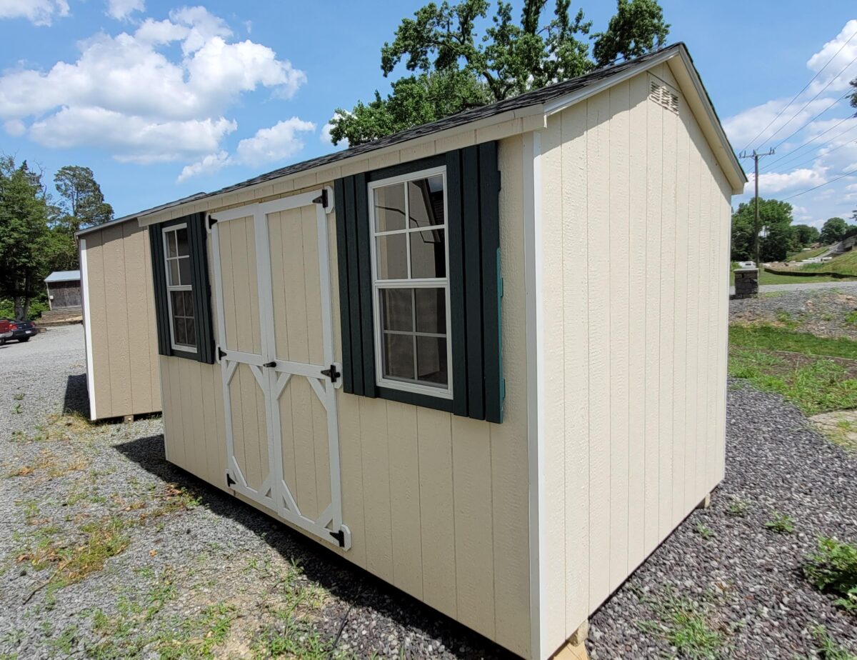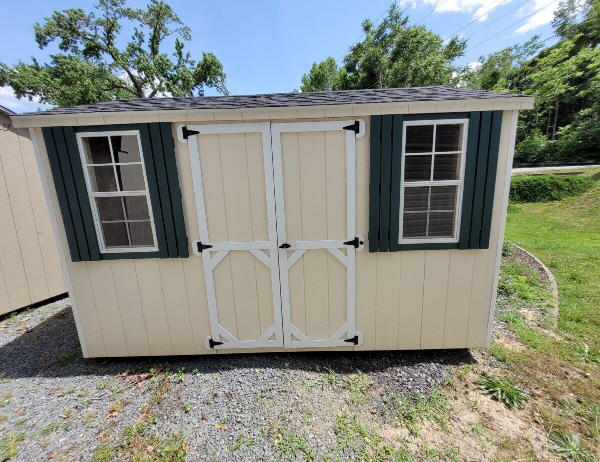 Featured in a cream body, white trims, green shutters and a charcoal roof size 8×12