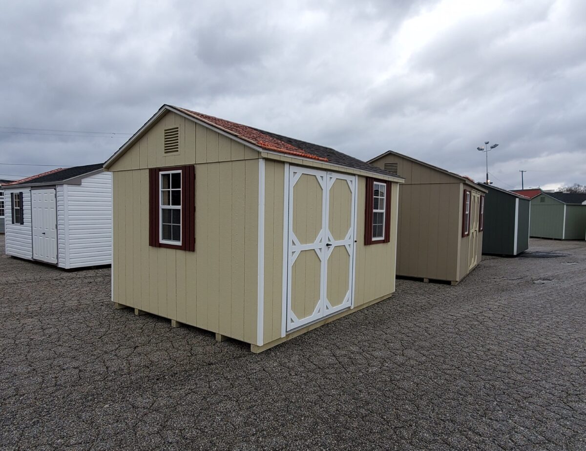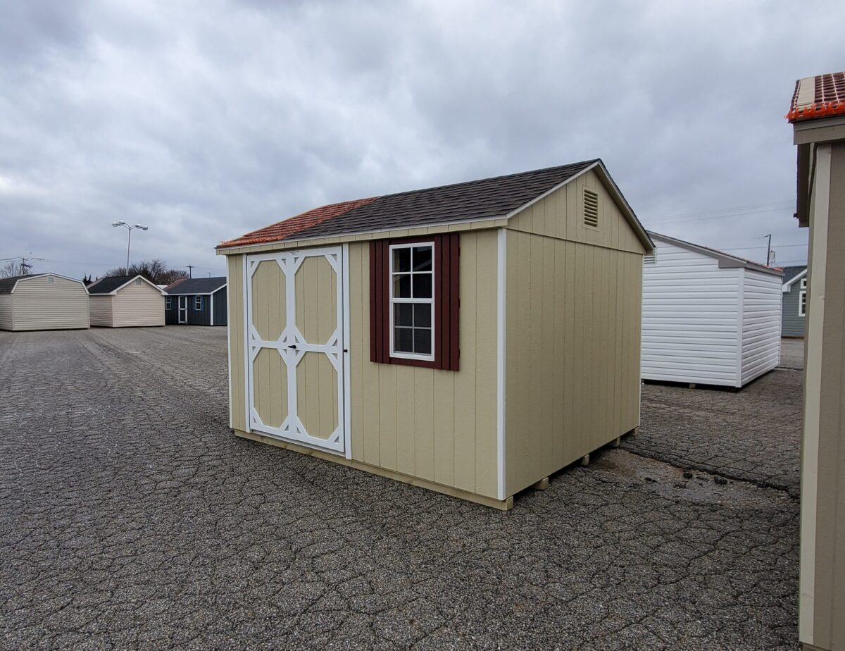 A Madison Peak shed with a Coated floor, (2) 10’x16″ shelves and upgraded Door hinges to Piano hinges for greater durability.