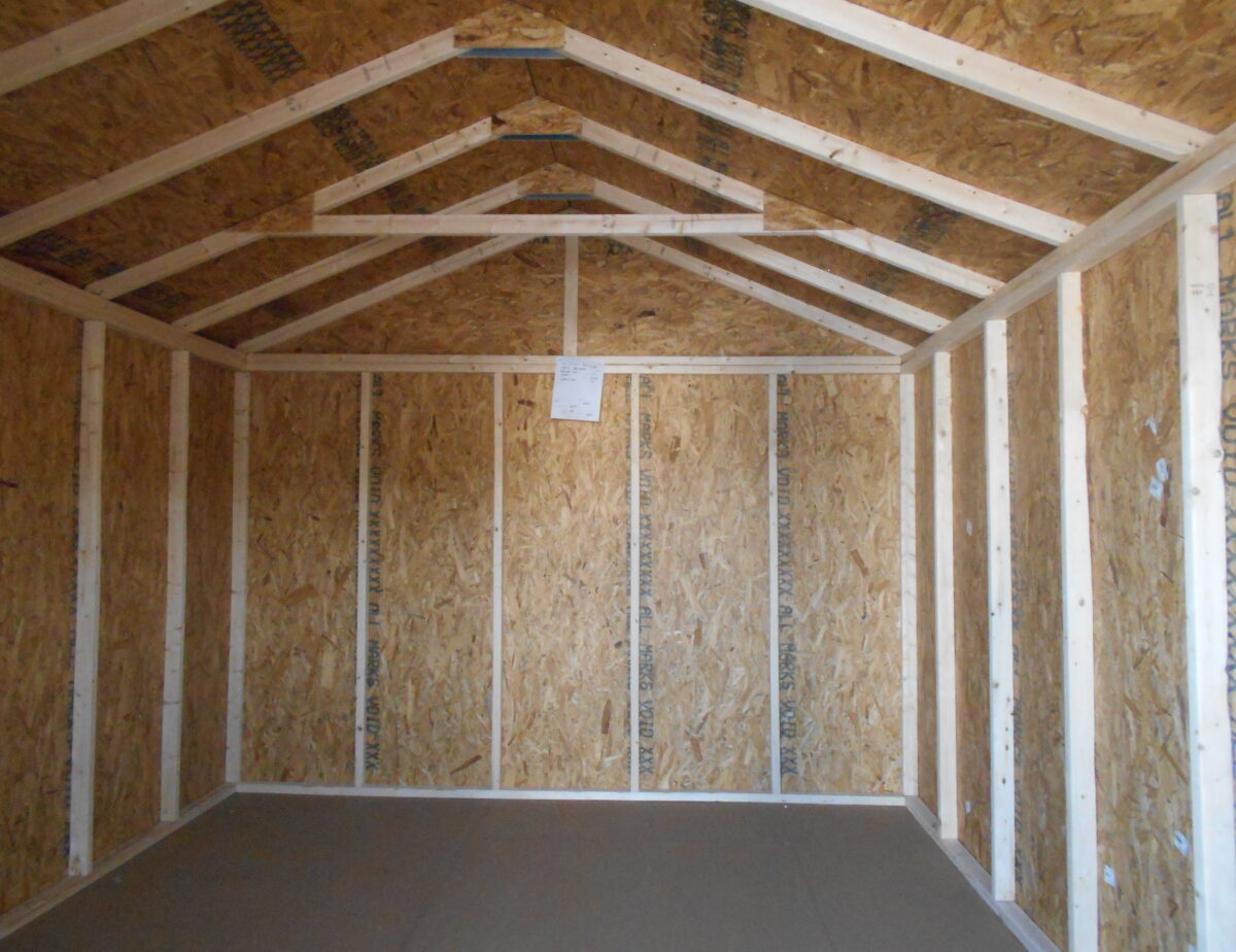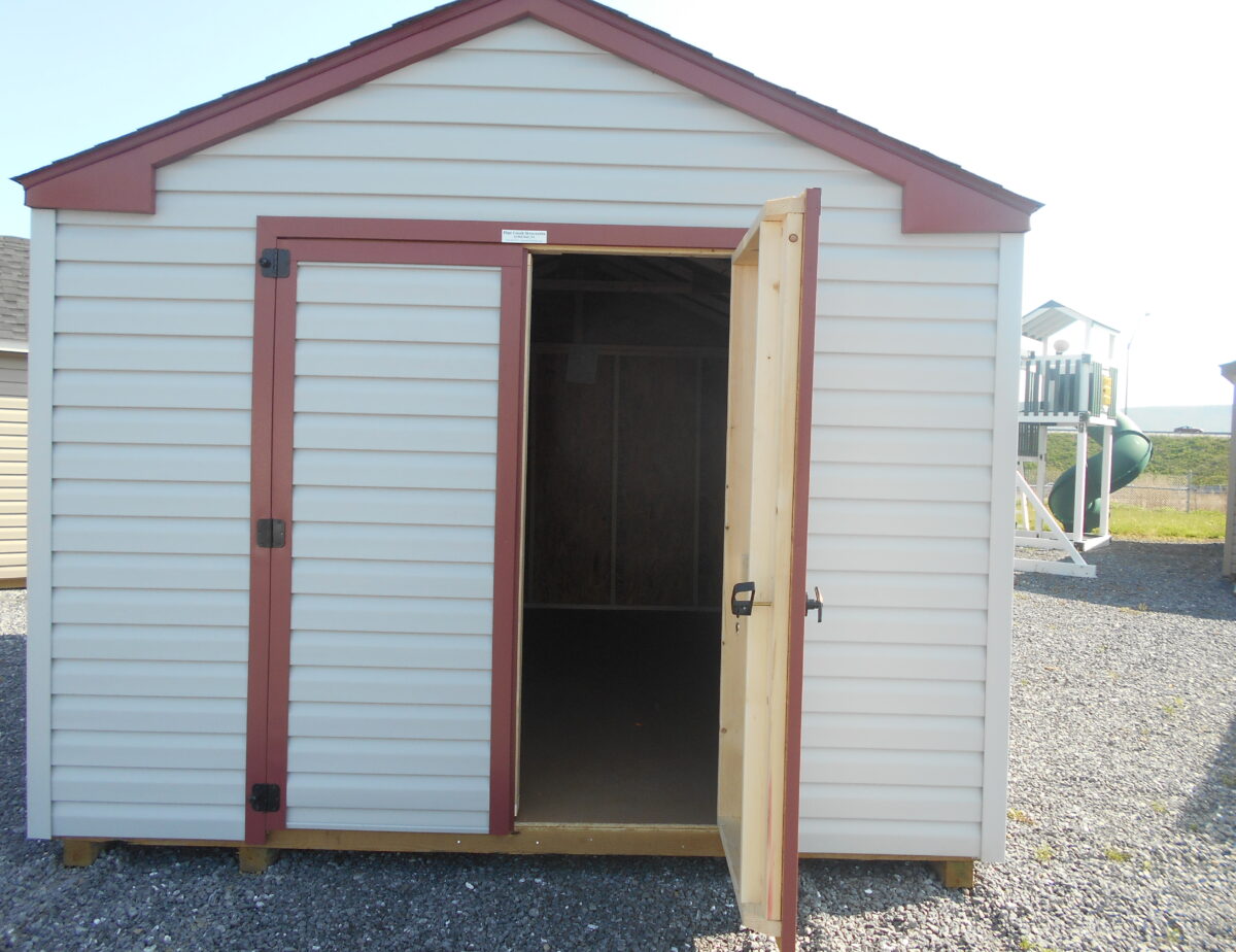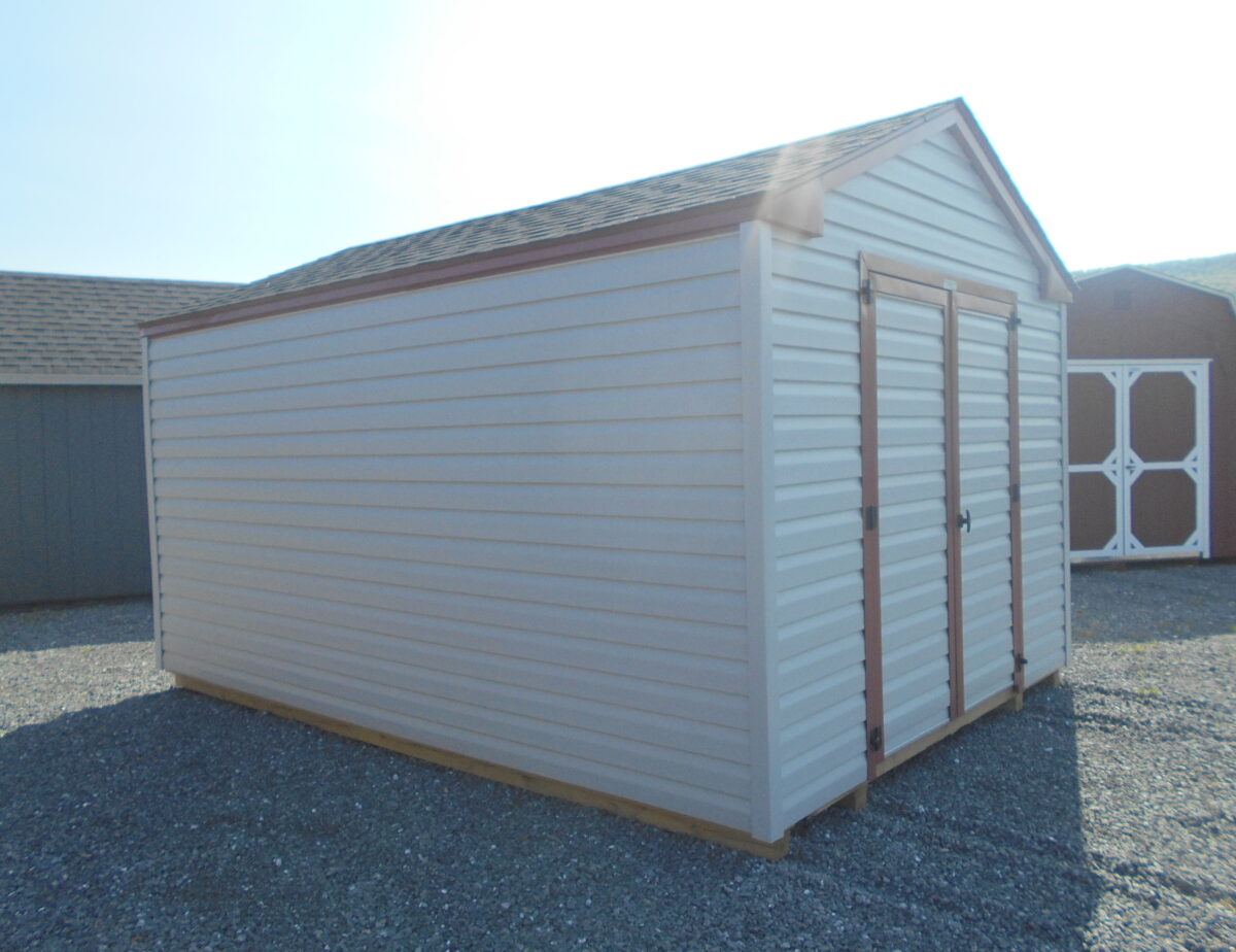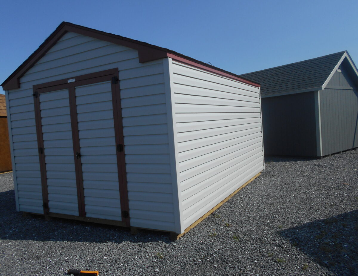 This 10 x 14 harbor stone and red trim features a Harbor Stone colored double door, A coated floor to protect it from any kind of weather changes. Very nice building to store any of your lawn care equipment or anything else you desire.
