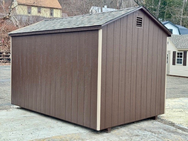 Available in Binghamton, NY: The Madison is designed with your budget in mind. This 8 x 12 Peak has 6′ wall height for wall hanging space or you can even install shelving. The Madison includes 4×4 pressure treated runners, 2×4 floor joists (16″ on center), upgraded Performax coated 5/8″ floor sheeting, 2×3 wall and rafter construction (24″ on center), 3″ overhang with aluminum drip edge and corner trim, keyed lock, and two air vents. Another quality yet economic choice from Pine Creek Structures.