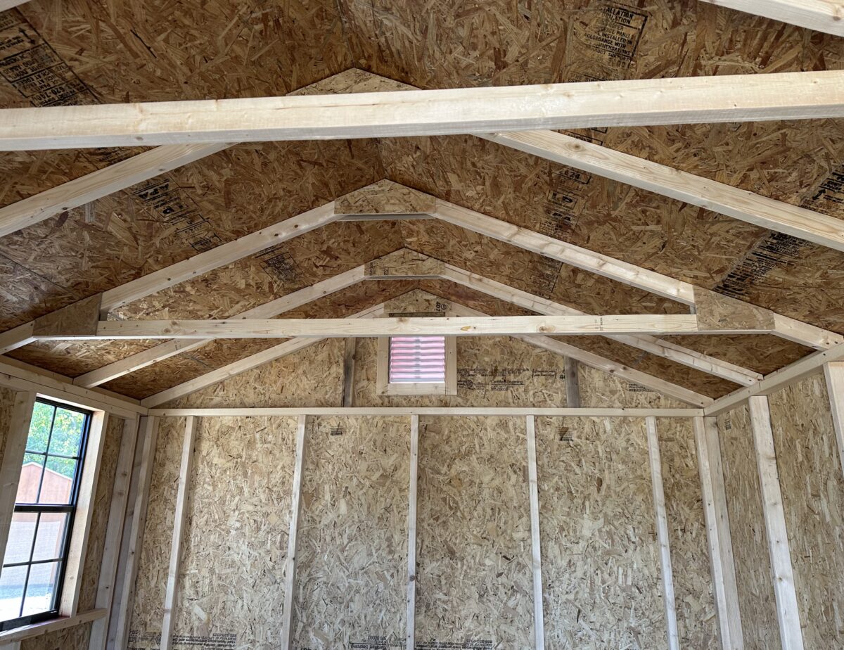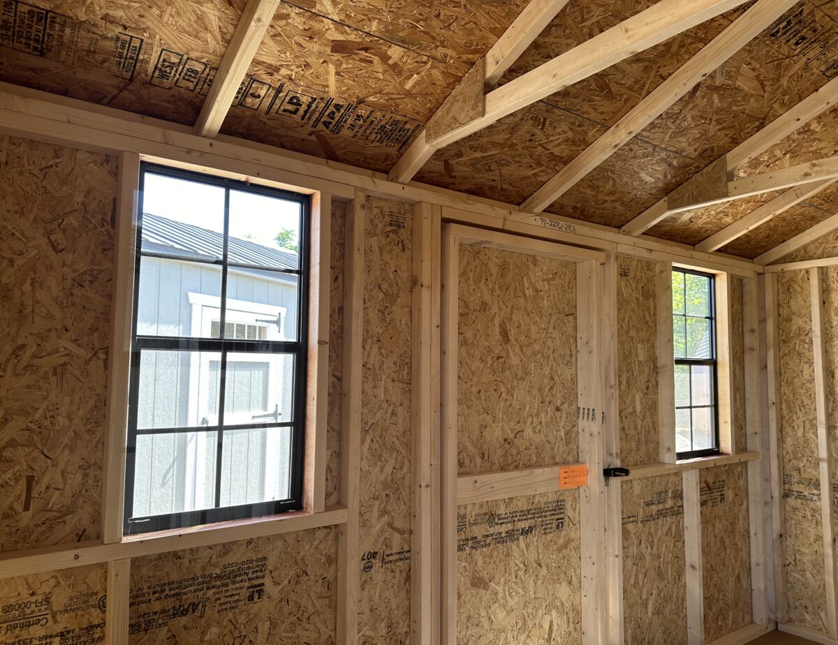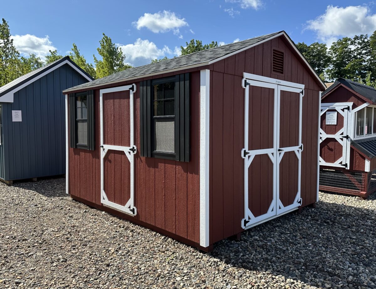 This 10×12 storage shed is located at our Berlin location. This structure has 5×6 double doors on the right gable end, and a single entry door centered on the 12′ wall with 2 18×36 single hung windows on each side. With this layout your larger items are in front of the double doors, and you can utilize the single entry door for access to smaller items. This shed comes with upgraded wood corners, a portable ramp system with 2 ramps, felt paper under the shingles, larger gable end vents, and a 3′ diamond kick plate under the single entry door. Ready for delivery, or you can order a building and choose your size, style, color scheme, and layout. Stop down to view this shed in person at Central Connecticut’s largest displays of storage sheds.