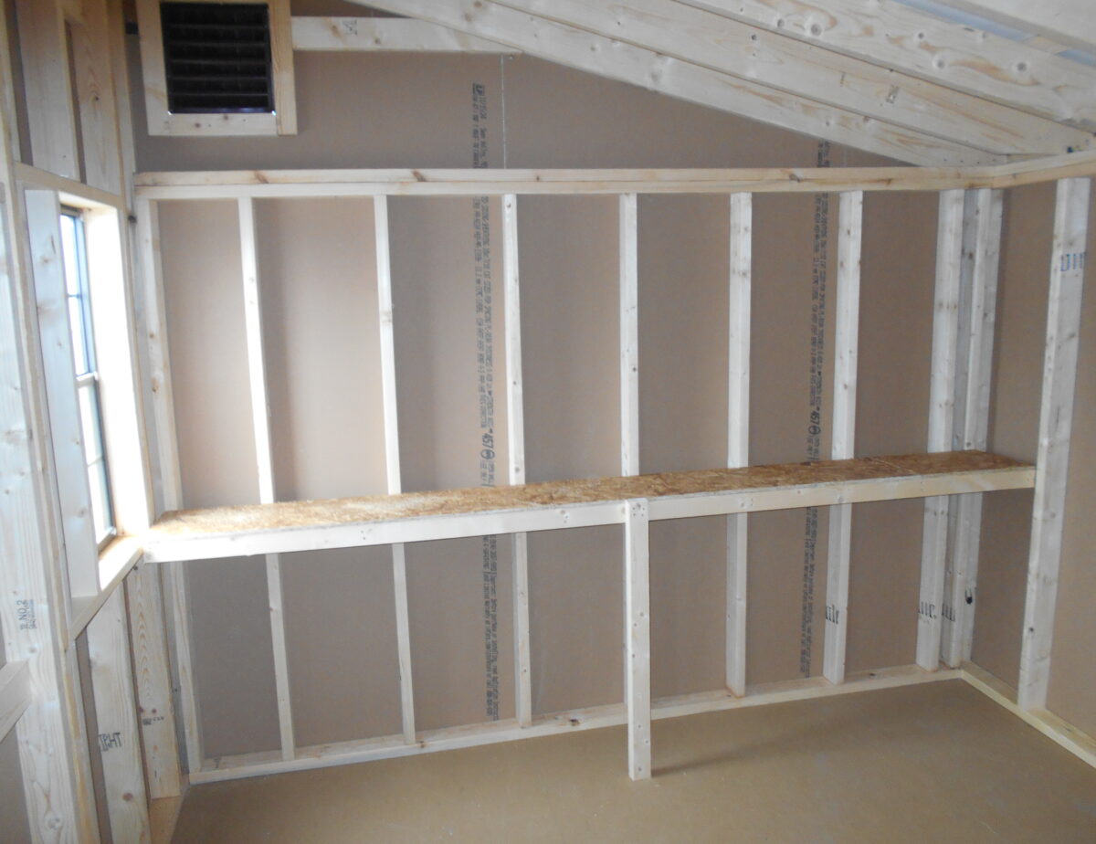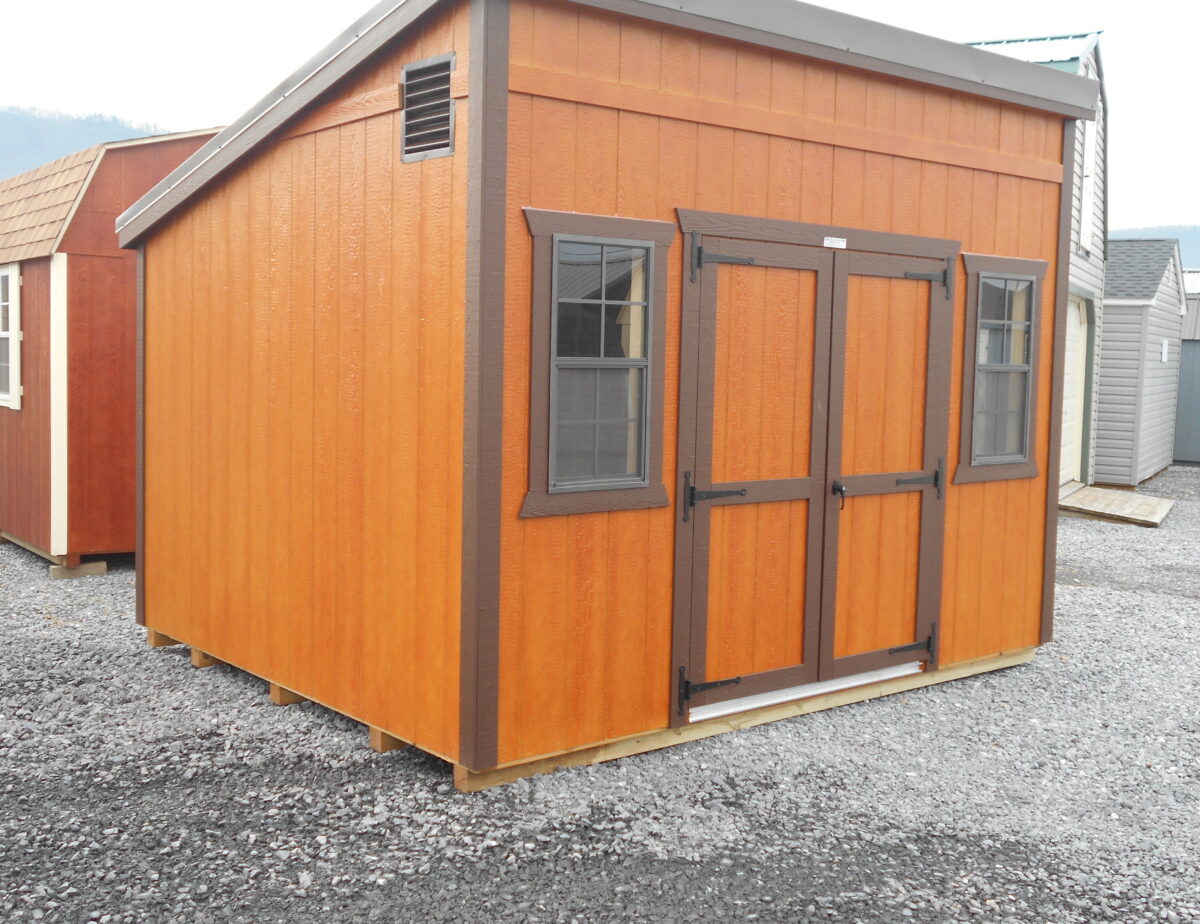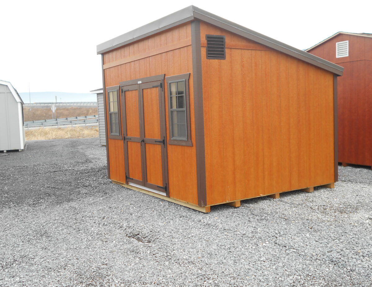 10 x12 Studio Lean To with rustic cedar siding and brown trim also comes with brown shutters and a burnish slate metal roof one 5′ door and two 18×36 windows, comes with Two 12×12 vents and a removable ramp 3″ corners and a 12” on each side shelve many special features included in this building.