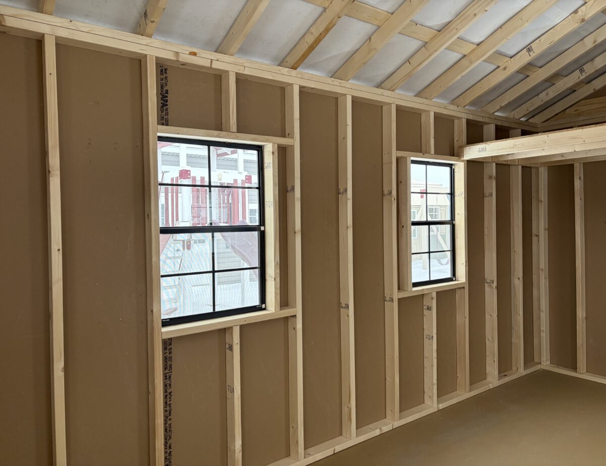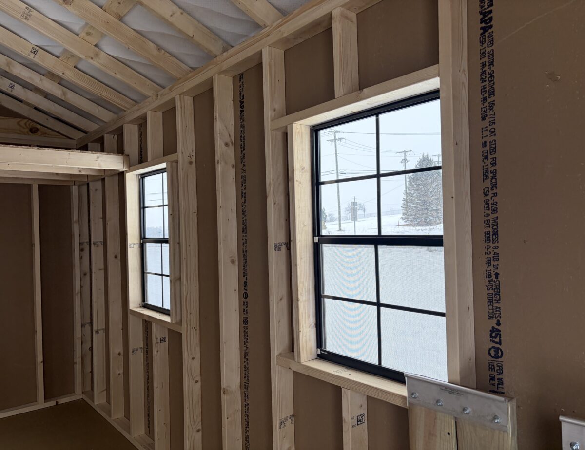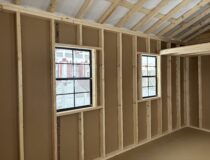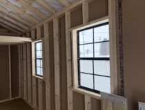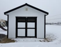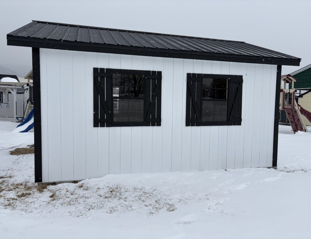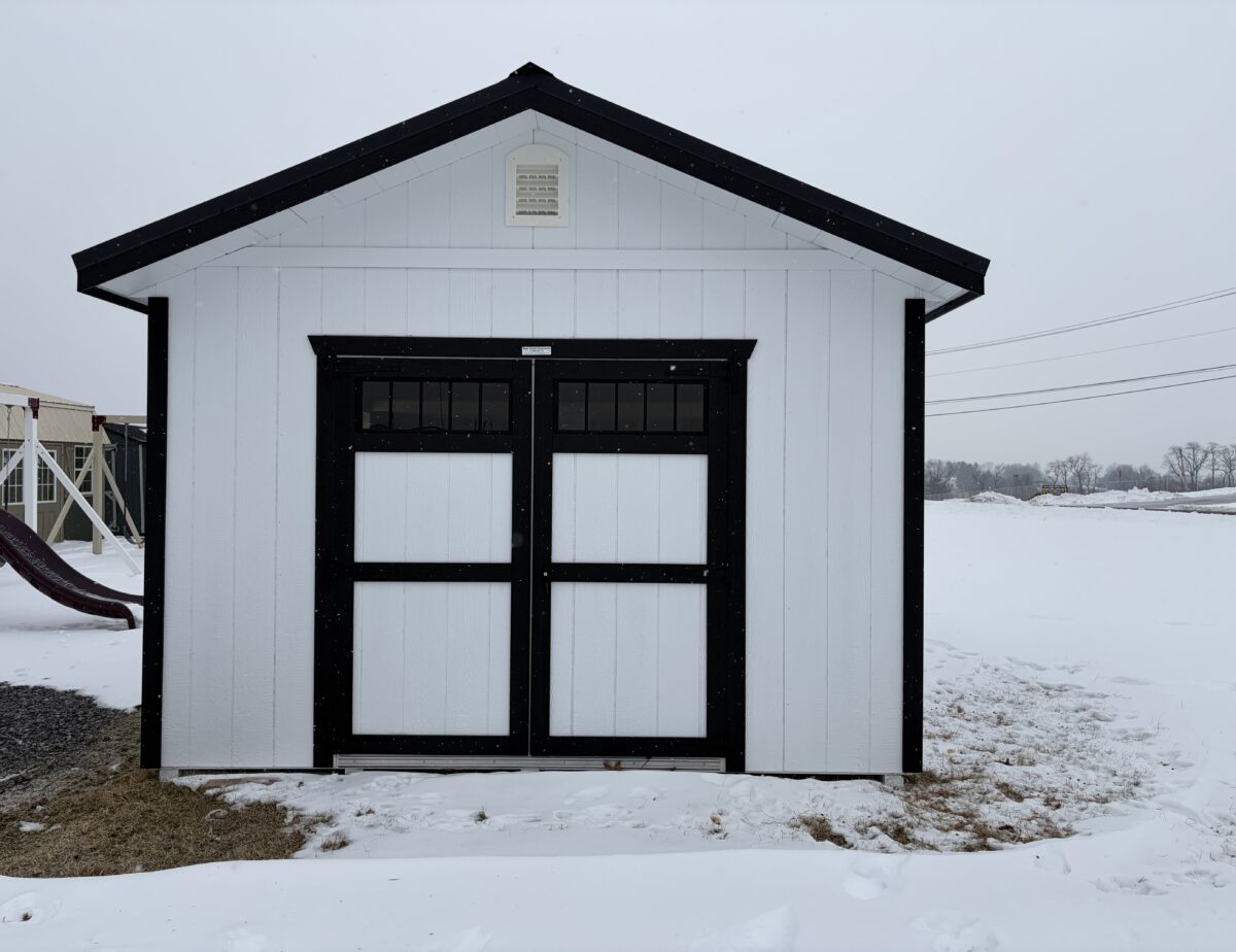 This 12 x 16 front peak features white siding with black trim and black shutters with a black metal textured rood 1 6’ double door and 4 24×36 black windows has 2 round end vents and a 2 peice removable ramp also comes with a 4×12 loft with a new England package added this building with for sure catch your eye