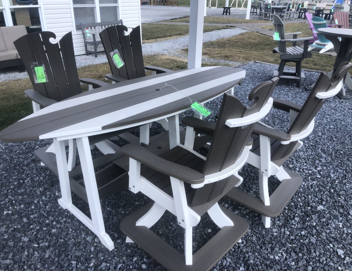 This a very attractive picnic table with 4 swivel chairs. Surf board design. call 717-361-8986 or etown@pinecreekstructures.com After hours call 717-629-9544. Bring a little of the beach home with this surf board table and swivel chairs.