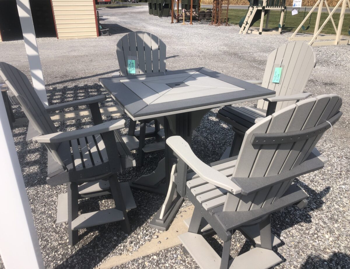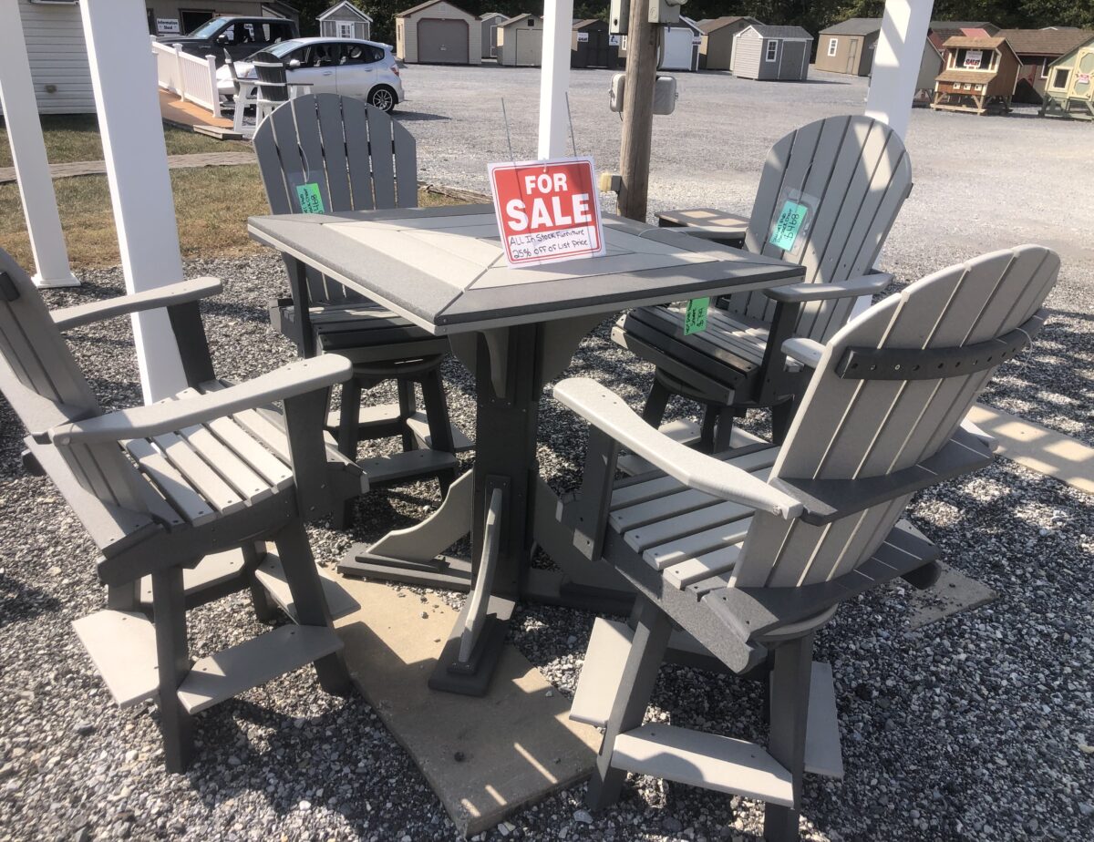 This table set is the most popular set we sell. call 717-361-8986 or etown@pinecreekstructures.com After hours call 717-629-9544. This table set and chairs are made out Composit and stainless steel screws.