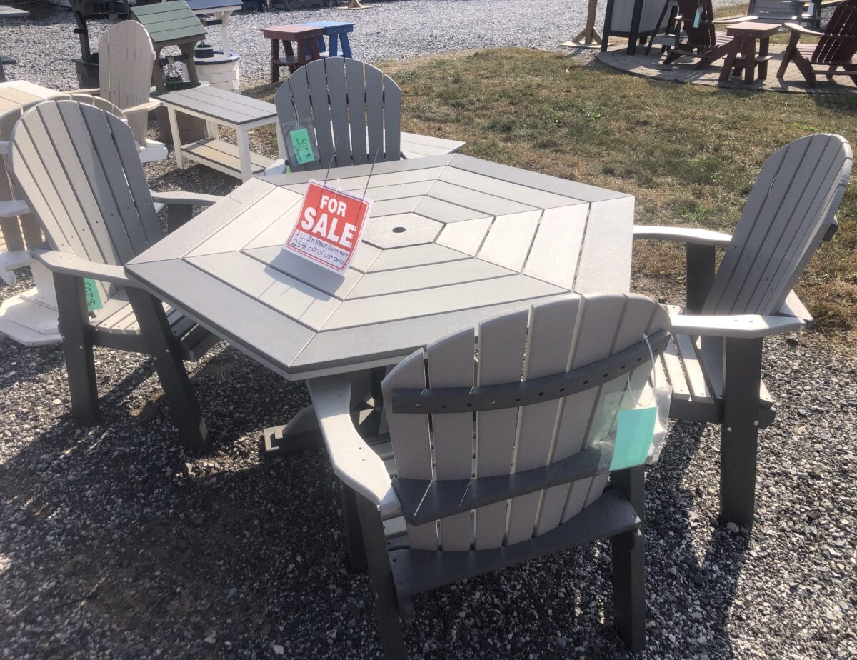 very nice hexagon table with 4 fan back chairs. call 717-361-8986 or etown@pinecreekstructures.com After hours call 717-629-9544. This table set is made out of composite and stainless steel screws. for years of enjoyment with no maintenance.