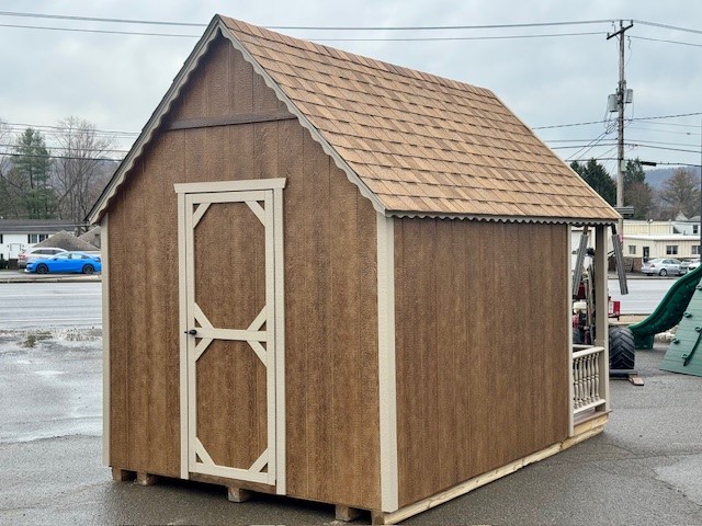 Available in Binghamton, NY: This Clubhouse is the perfect place to unleash your child’s imagination. This clubhouse has a 3′ x 8′ porch with an inside loft overhead which includes an 8″ x 8″ diamond window, railing, and ladder. The added 1′ wall height on this Clubhouse allows for bigger kids and adults to enjoy for many years. There is a 30 x 72 entry door in the back side for adults to get in or use as a cute storage shed when the kids grow up