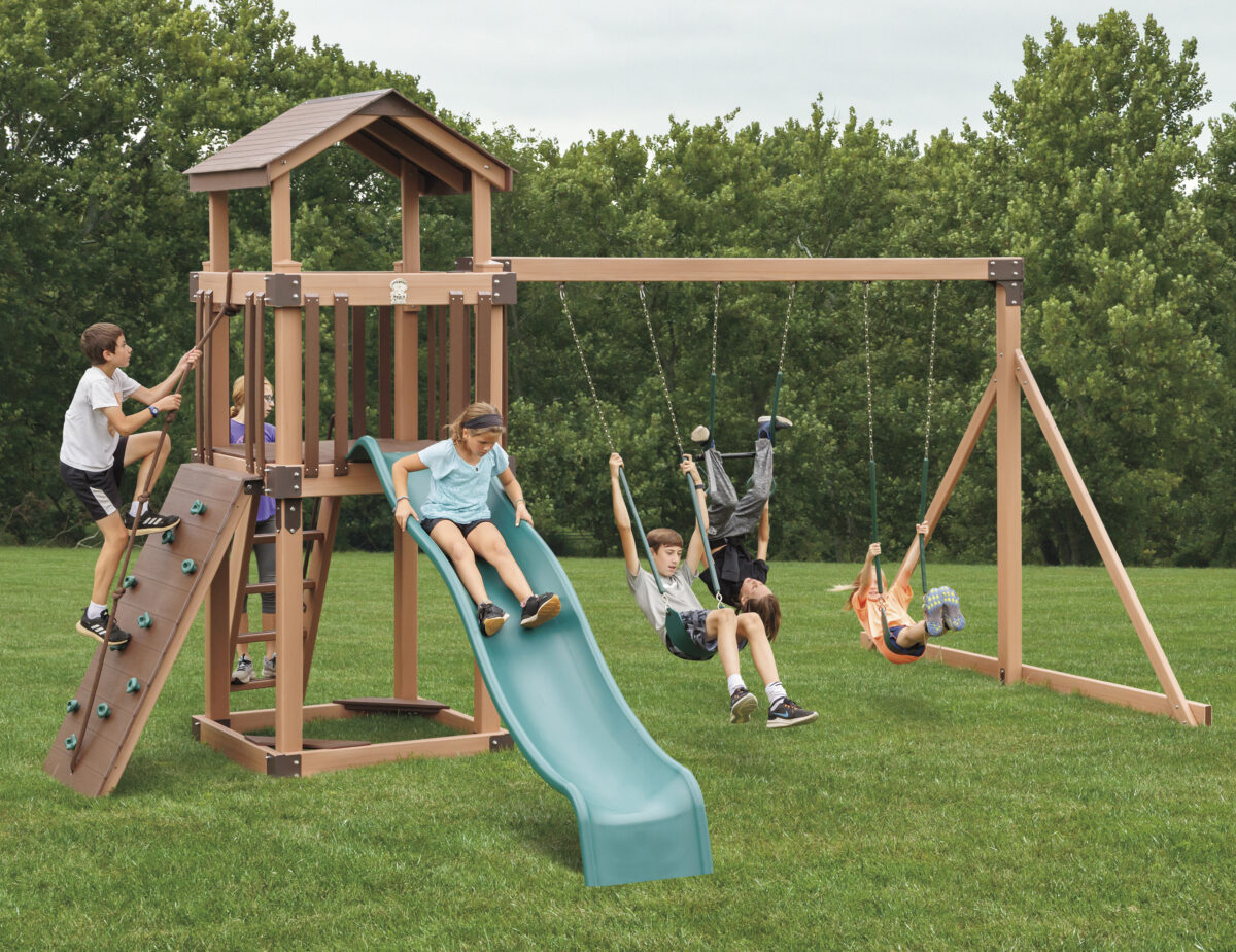 The Basecamp model is very customizable swing set. Each model comes with a tower, one slide, two swings, and a trapeze. Add-ons can include a rock wall, an additional slide, an entrance ladder, a gangplank, monkey bars, a glider, and a tire swing. This model can have an extra high swing beam. Slides featured on these sets are the Wonder Wave, the Twisty Turbo, the Tunnel Express, and two types of Ripple Rush slides.