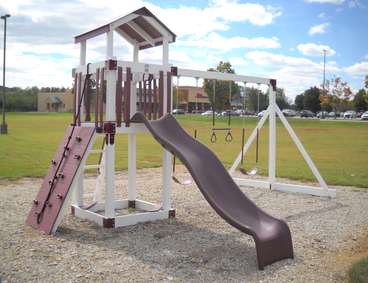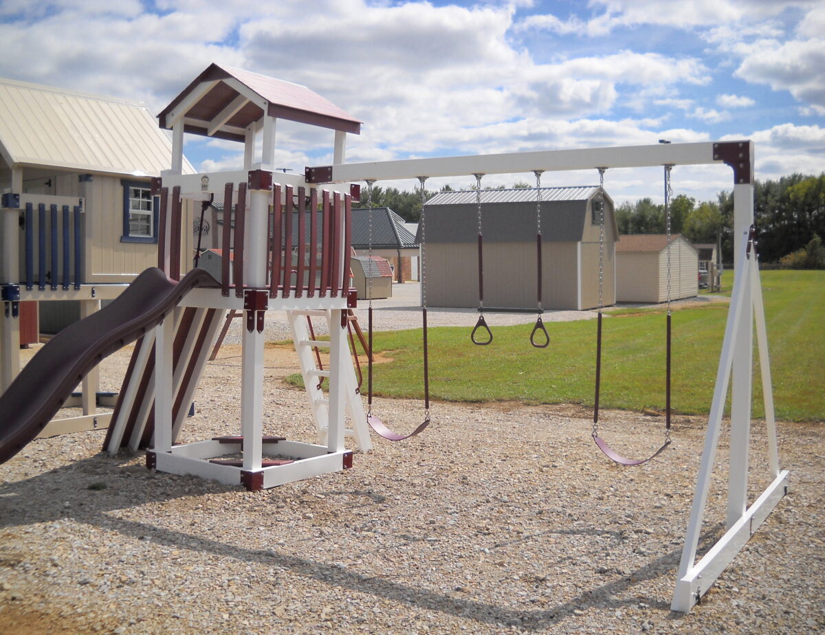Amish Hand Crafted Play Set from Adventure World Playsets Stop by and give them a swing . The B44-6 Features a 4’x’4 Tower 5ft high With Stairs ,Rock Wall, Wave Slide , 3 position Swing Beam and 2- belt swings and Trapeze Bar. Stop by our sales lot and give them swing. For more info on this and our other models call Tim 717-345-6541 or email pinecreektim@yahoo.com Financing is available Also Rent to Own .