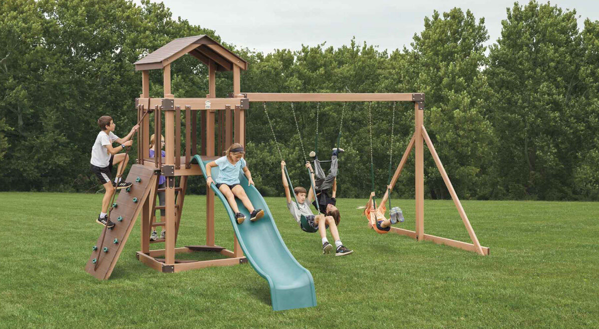 The Busy Base Camp B44-6 is the perfect solution for families seeking a high-quality, “Amish Tough” playset that fits comfortably in smaller backyard spaces. This model features a classic 4×4 tower with a 5-foot deck height, providing a safe and sturdy elevated play area. The entire structure is wrapped in maintenance-free vinyl, meaning you’ll never have to worry about the annual chore of sanding, painting, or staining to keep it looking like new.