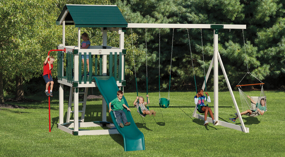 Upgrade your backyard with the Busy Base Camp B55-7 Playset, our most feature-packed model in the Base Camp series. This “Amish Tough” structure boasts a massive 5×5 deck at a 5-foot height, giving children plenty of room for imaginative play. A heavy-duty vinyl roof shields the tower, providing essential shade and protection from the sun.