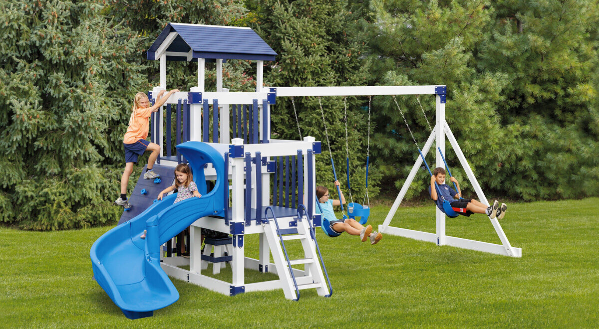 The Discovery Depot D48-1 is a versatile, space-efficient playset designed to get little legs climbing and creative minds soaring. Built with “Amish Tough” durability, this set features a 4×8 split-level deck with platform heights at 3 feet and 5 feet, making it an excellent choice for younger children as they grow. The entire structure is wrapped in high-quality vinyl for a maintenance-free finish that requires no staining or painting.