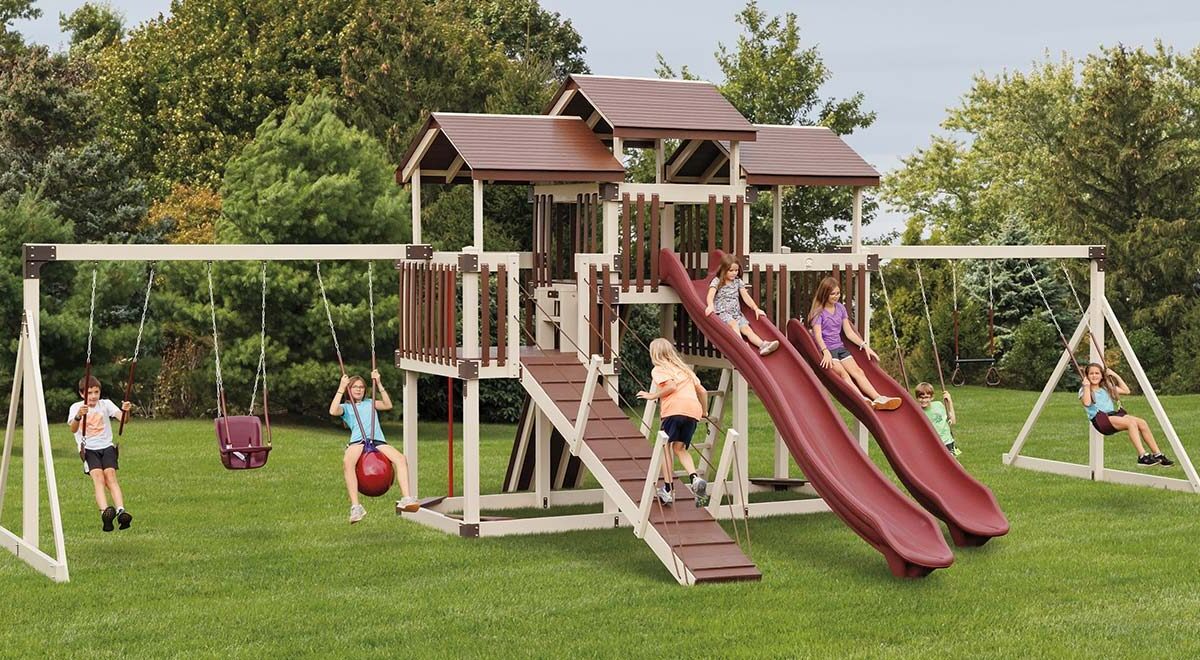 Each Fantasy Fortress comes with not one, not two, but THREE levels of decking! This play set has swing beams on both sides of the triple towers, allowing for an entire gaggle of children to play at the same time. This play set comes with a 5×14 split level tower with 5′ and 7′ heights, 3 vinyl roofs, an entrance ladder, 7′ rock wall, gangplank, 2-3 position single swing beams, 3 belt swings, trapeze, ball swing, high back baby swing, ripple rush slide, extreme ripple rush slide, and a fireman’s pole.