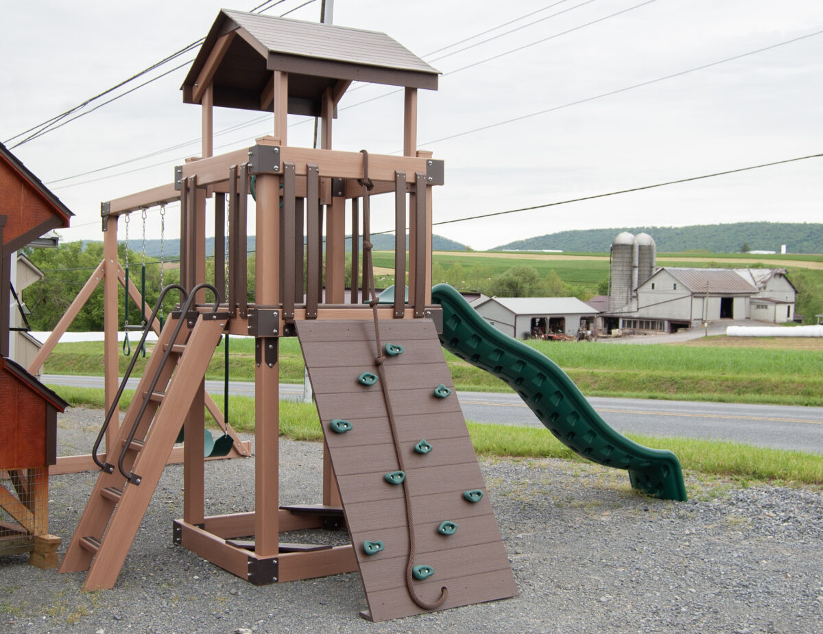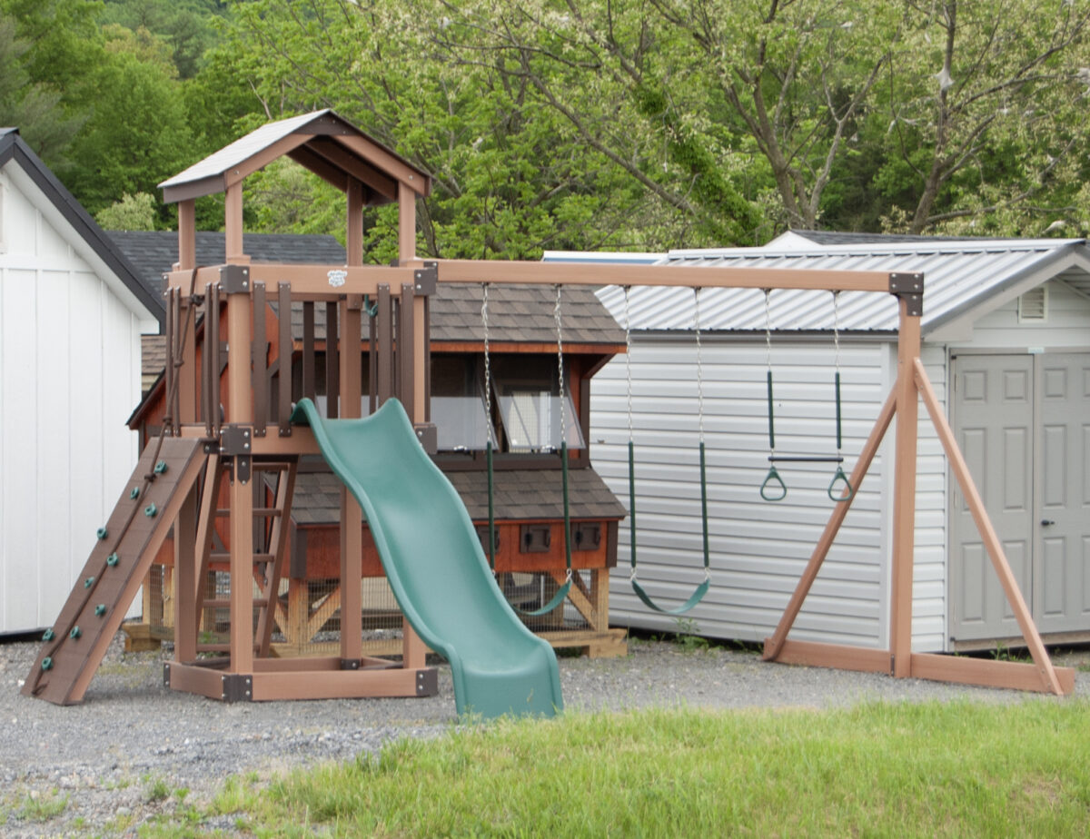 The Busy Base Camp B44-6 vinyl play set features a single tower with an entrance ladder and a rock wall, two belt swings, trapeze, and a wonder wave slide. Come see it in person and learn more about all your play set choices at Pine Creek Structures of Spring Glen (Hegins), PA. Call (570) 682-9625 for more info.
