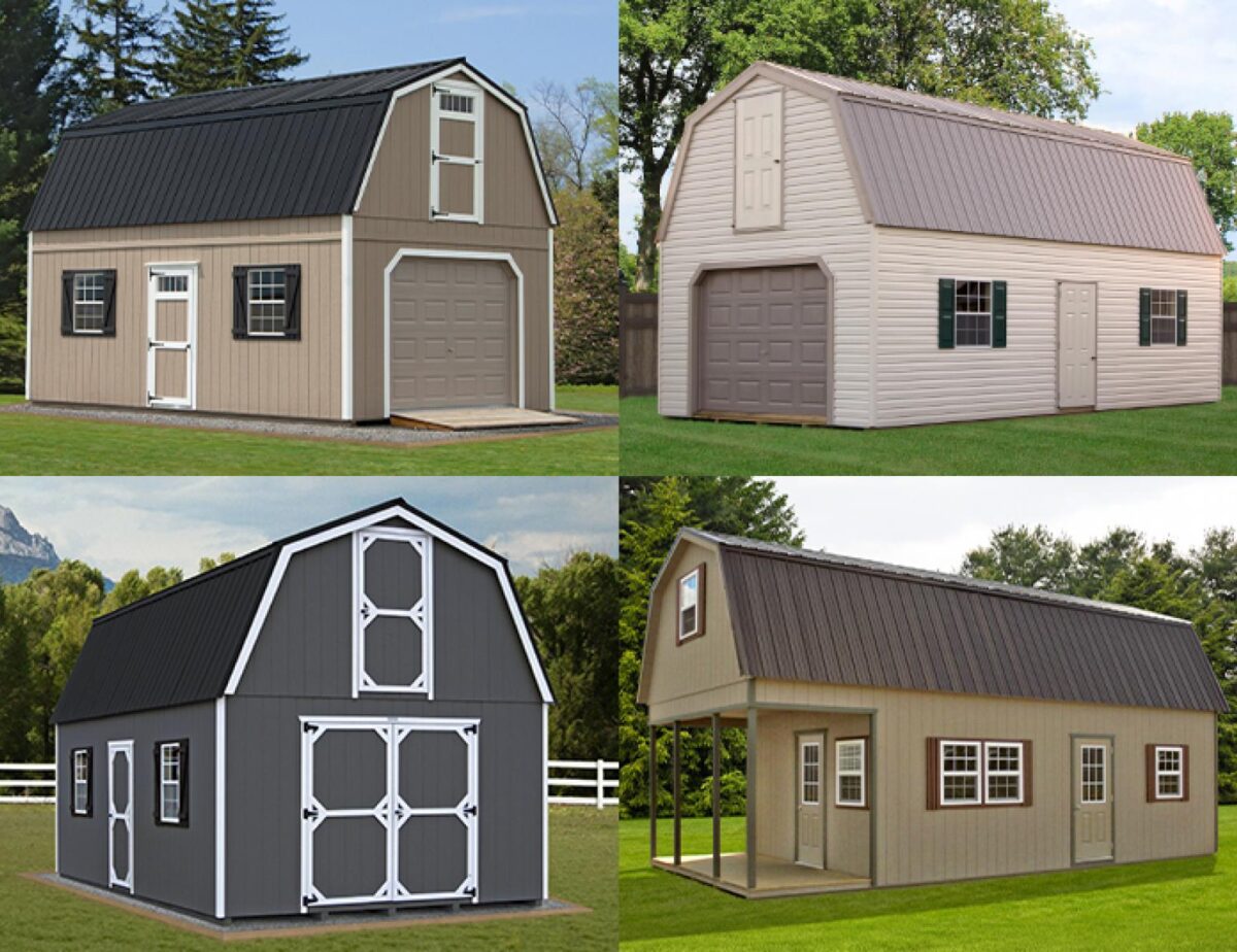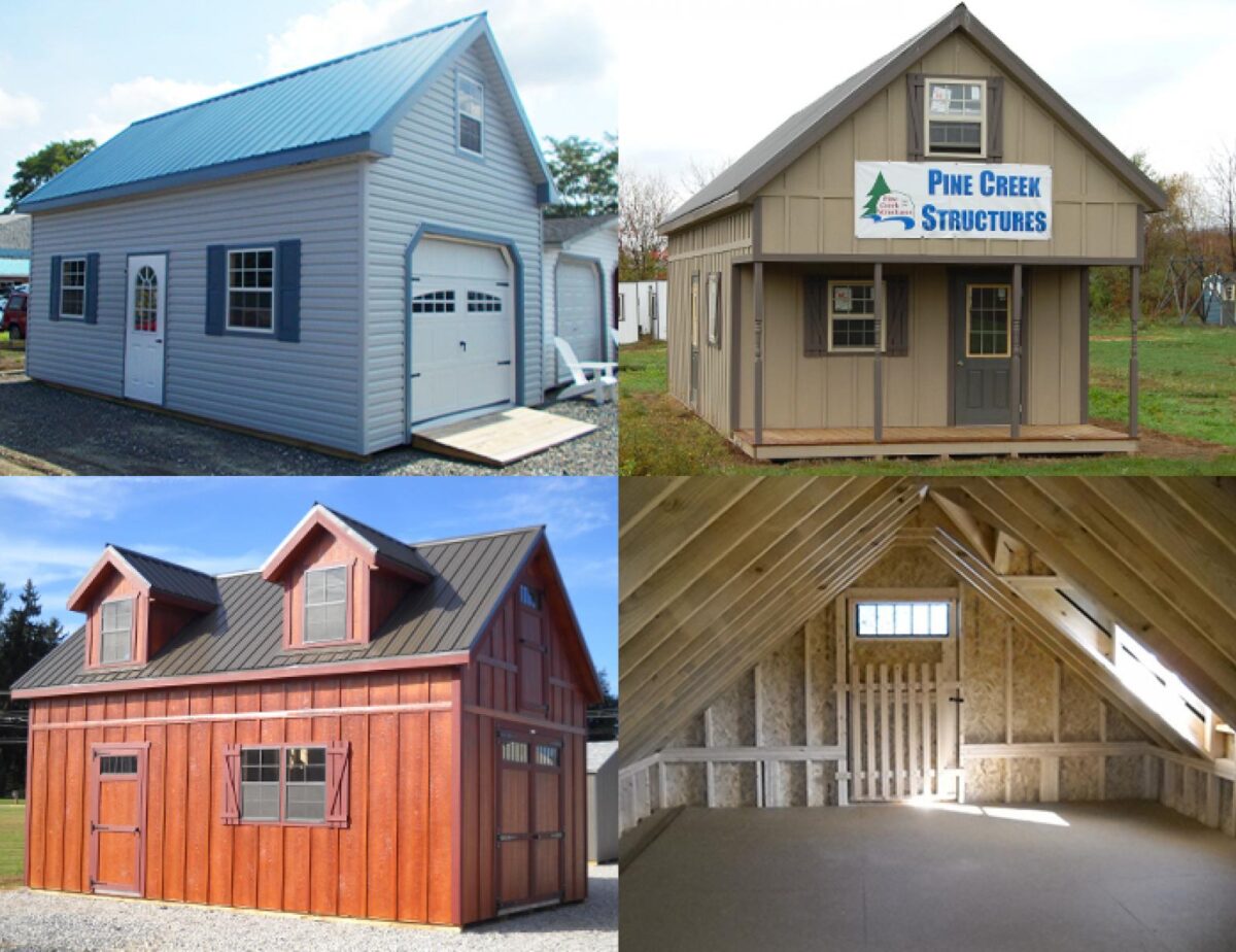 Our Two-Stories come in either a shed package (with a standard shed floor and double doors) or a garage package (with a heavier floor and an overhead garage door)! Both styles include a built in staircase up to the second floor. Now also available with a Cape Cod style roof (shown in photo 3)!