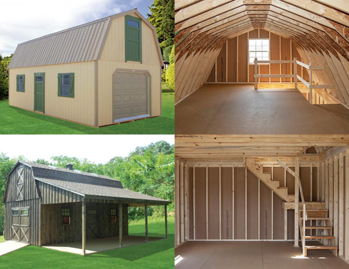 - SHED/WORKSHOP STYLE includes a 6'x6' double door, two 36'' single doors, two 30''x36'' windows with shutters, interior staircase to second floor and choice of metal or shingle roof.